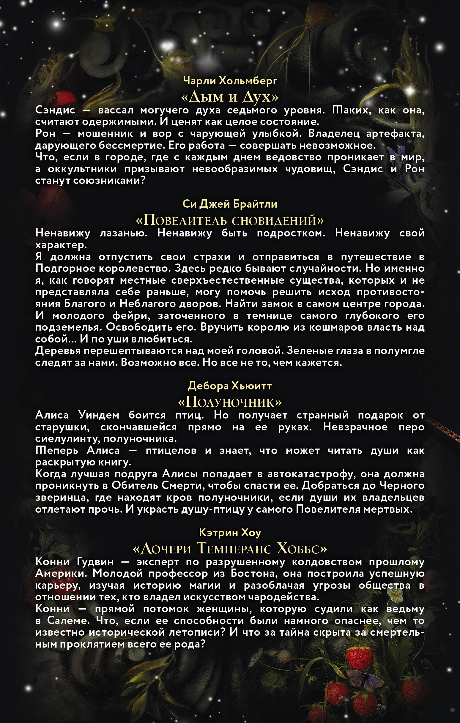 В комплект входят четыре книги: «Дым и дух» Чарли Хольмберг, «Повелитель сновидений» Си Джей Брайтли, «Полуночник» Дебора Хьюитт, «Дочери Темперанс Хоббс» Кэтрин Хоу. «Дочери Темперанс Хоббс» Конни Гудвин - эксперт по разрушенному колдовством прошлому Америки. Молодой профессор из Бостона, она построила успешную карьеру, изучая историю магии и разоблачая угрозы общества в отношении тех, кто владел искусством чародейства. Конни - прямой потомок женщины, которую судили как ведьму в Салеме. Что, если ее способности были намного опаснее, чем то известно исторической летописи? И что за тайна скрыта за смертельным проклятием всего ее рода? «Полуночник» Алиса Уиндем боится птиц. Но получает странный подарок от старушки, скончавшейся прямо на ее руках. Невзрачное перо сиелулинту, полуночника. Теперь Алиса - птицелов, и знает, что может читать души как раскрытую книгу. Когда лучшая подруга Алисы попадает в автокатастрофу, она должна проникнуть в Обитель Смерти, чтобы спасти ее. Добраться до Черного зверинца, где находят кров полуночники, если души их владельцев отлетают прочь. И украсть душу-птицу у самого Повелителя мертвых. «Повелитель сновидений» Ненавижу лазанью. Ненавижу быть подростком. Ненавижу свой характер. Я должна отпустить свои страхи и отправиться в путешествие в Подгорное королевство. Здесь редко бывают случайности. Но именно я, как говорят местные сверхъестественные существа, которых и не представляла себе раньше, могу помочь решить исход противостояния Благого и Неблагого дворов. Найти замок в самом центре города. И молодого фейри, заточенного в темнице самого глубокого его подземелья. Освободить его. Вручить королю из кошмаров власть над собой... И по уши влюбиться. Деревья перешептываются над моей головой. Зеленые глаза в полумгле следят нами. Возможно все. Но все не то, чем кажется. «Дым и Дух» Сэндис - вассал могучего духа седьмого уровня. Таких, как она, считают одержимыми. И ценят, как целое состояние. Рон - мошенник и вор с чарующей улыбкой. Владелец артефакта, дарующего бессмертие. Его работа - совершать невозможное. Что, если в городе, где с каждым днем ведовство проникает в мир, а оккультники призывают невообразимых чудовищ, Сэндис и Рон станут союзниками?| Издательство | ООО "Издательство "Эксмо" |