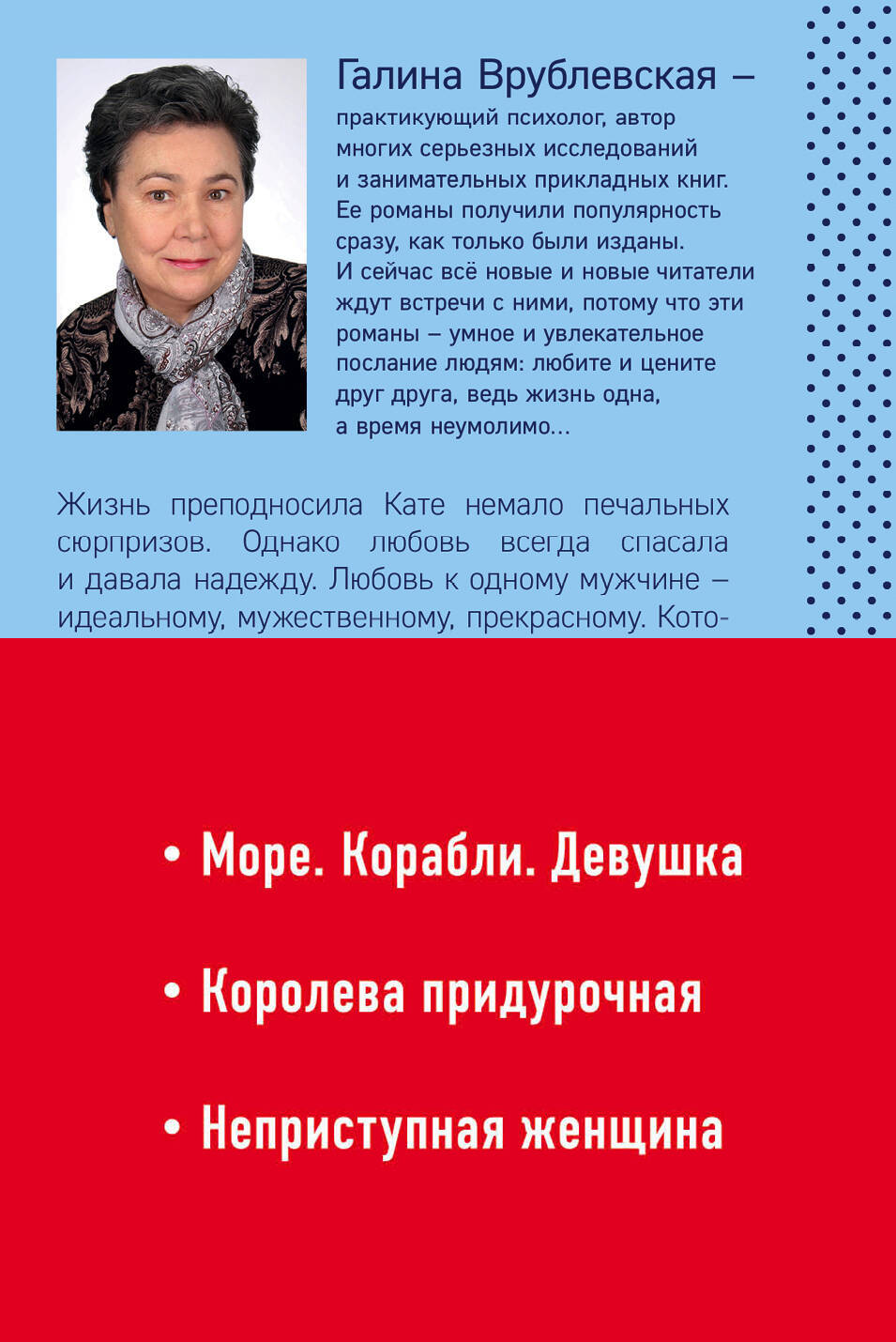 Море. Корабли. Девушка Жизнь преподносила Кате немало печальных сюрпризов. Однако любовь всегда спасала и давала надежду. Любовь к одному мужчине - идеальному, мужественному, прекрасному. Который мог стать ей отцом, защитником, другом… Но мужем? Нет, конечно, нет. Во-первых, он был несвободен. Во-вторых, старше на много лет. И хотя они всегда были рядом, и оба всем сердцем стремились друг к другу - что-то, а порой и кто-то их постоянно разделял. Так, может, сама судьба противится - и потому не нужно идти наперекор ей, а искать тихую гавань в обществе другого мужчины? Королева придурочная Сбежав от мужа, который распускал руки и оскорблял, Ксения Королева вовсе не чувствовала себя королевой в изгнании. Ей хотелось найти надежный приют, встретить человека, с которым было бы возможно простое женское счастье. И судьба послала страдалице Родиона - благородного и любящего. Казалось, все теперь будет хорошо. Но их отношения испортила позавидовавшая подруга - та самая, которую с детства опекала и поддерживала Ксения. Не повод ли это пересмотреть свою жизнь - и стать наконец ее властительницей? Неприступная женщина Семейная легенда о том, что её род появился благодаря писателю Куприну, заставила Маргариту Орехову написать роман об известном авторе. Текст удался и его даже выдвинули на престижную литературную премию. Но Маргарита не знала, что рука об руку с писательской славой идут предательство и зависть. Её подруга Кристина была готова совершить любую подлость, чтобы не допустить успеха коллеги по перу. Раскрыть семейную тайну, справиться с предательством и разглядеть настоящую любовь может только по-настоящему талантливый человек. Такова ли Маргарита на самом деле?| Издательство | ООО "Издательство "Эксмо" |