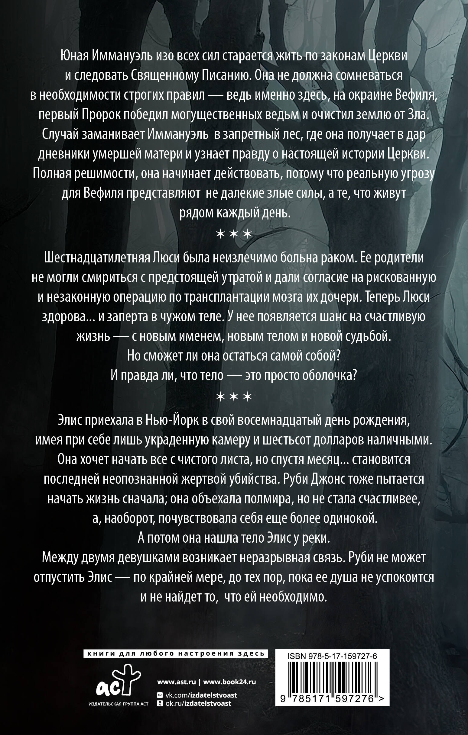 Юная Иммануэль изо всех сил старается жить по законам Церкви и следовать Священному Писанию. Она не должна сомневаться в необходимости строгих правил - ведь именно здесь, на окраине Вефиля, первый Пророк победил могущественных ведьм и очистил землю от Зла. Случай заманивает Иммануэль в запретный лес, где она получает в дар дневники умершей матери и узнает правду о настоящей истории Церкви. Полная решимости, она начинает действовать, потому что реальную угрозу для Вефиля представляют не далекие злые силы, а те, что живут рядом каждый день. *** Шестнадцатилетняя Люси была неизлечимо больна раком. Ее родители не могли смириться с предстоящей утратой и дали согласие на рискованную и незаконную операцию по трансплантации мозга их дочери. Теперь Люси здорова… и заперта в чужом теле. У нее появляется шанс на счастливую жизнь - с новым именем, новым телом и новой судьбой. Но сможет ли она остаться самой собой? И правда ли, что тело - это просто оболочка? *** Элис приехала в Нью-Йорк в свой восемнадцатый день рождения, имея при себе лишь украденную камеру и шестьсот долларов наличными. Она хочет начать все с чистого листа, но спустя месяц… становится последней неопознанной жертвой убийства. Руби Джонс тоже пытается начать жизнь сначала; она объехала полмира, но не стала счастливее, а наоборот, почувствовала себя еще более одинокой. А потом она нашла тело Элис у реки. Между двумя девушками возникает неразрывная связь. Руби не может отпустить Элис - по крайней мере до тех пор, пока ее душа не успокоится и не найдет то, что ей необходимо.| Издательство | ИЗДАТЕЛЬСТВО "АСТ" |