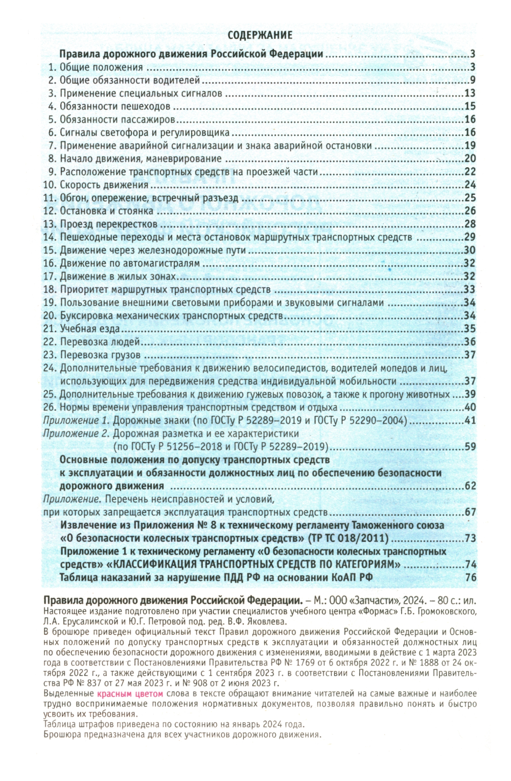 Комплект из 15 одинаковых книг для учебных учреждений: «Правила дорожного движения 2024 с дополненной реальностью и иллюстрациями с изменениями» Настоящее издание подготовлено при участии специалистов учебного центра «Формас» Г. Б. Громоковского, Л. А. Ерусалимской и Ю. Г. Петровой. В брошюре приведен официальный текст Правил дорожного движения Российской Федерации и Основных положений по допуску транспортных средств к эксплуатации и обязанностей должностных лиц по обеспечению безопасности дорожного движения, вводимыми в действие с 1 марта 2023 года в соответствии с Постановлениями Правительства РФ. Выделенные красным цветом слова в тексте обращают внимание читателей на самые важные и наиболее трудно воспринимаемые положения нормативных документов, позволяя правильно понять и быстро усвоить их требования. Таблица штрафов приведена по состоянию на январь 2024 года. Брошюра предназначена для всех участников дорожного движения.| Издательство | Третий Рим |