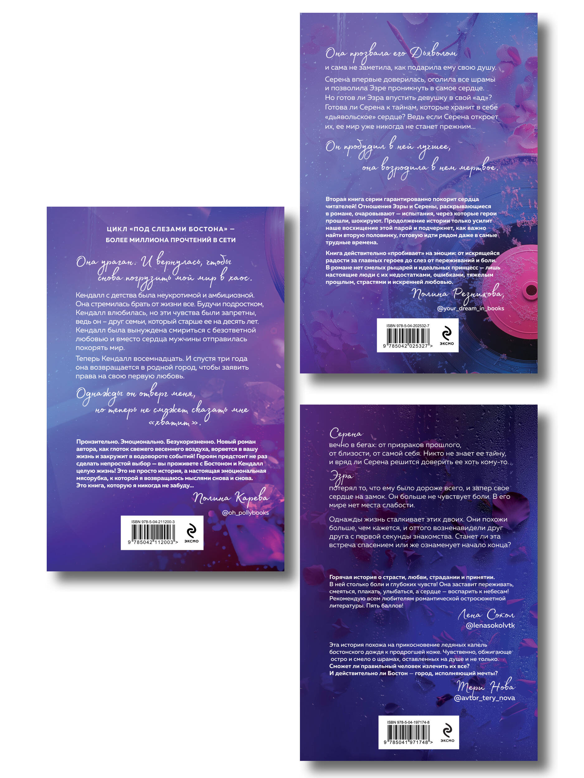 Комплект из 3-х книг Таши Мисник: «Под слезами Бостона. Дьявол не спит», «Под слезами Бостона. Больше, чем ад» и «В сердце Бостона. Демоны внутри нас»! «Под слезами Бостона. Дьявол не спит» Серена вечно в бегах: от призраков прошлого, от близости, от самой себя. Никто не знает ее тайну, и вряд ли Серена решится доверить ее хоть кому-то. Эзра потерял то, что ему было дороже всего, и запер свое сердце на замок. Он больше не чувствует боли. В его мире нет места слабости. Однажды жизнь сталкивает этих двоих. Они похожи больше, чем кажется, и оттого возненавидели друг друга с первой секунды знакомства. Станет ли эта встреча спасением или же ознаменует начало конца? «Под слезами Бостона. Больше, чем ад» Она прозвала его Дьяволом и сама не заметила, как подарила ему свою душу. Серена впервые доверилась, оголила все шрамы и позволила Эзре проникнуть в самое сердце. Но готов ли Эзра впустить девушку в свой «ад»? Готова ли Серена к тайнам, которые хранит в себе «дьявольское» сердце? Ведь если Серена откроет их, ее мир уже никогда не станет прежним... Он пробудил в ней лучшее, она возродила в нем мертвое. «В сердце Бостона. Демоны внутри нас» Уже в детстве Бостон отличался острым умом и сдержанностью. Он вырос идеальным мужчиной, добился успеха и привык все держать под контролем. Теперь Бостон безупречен. Его жизнь - продуманный план. У него блестящая карьера, роскошная невеста, много денег и власти. У Бостона нет слабых мест. Разве что... Одна бестия из прошлого… Кендалл с детства была неукротимой и амбициозной. Она стремилась брать от жизни все. Будучи подростком, Кендалл влюбилась, но эти чувства были запретны, ведь он - друг семьи, который старше ее на десять лет. Кендалл была вынуждена смириться с безответной любовью и вместо сердца мужчины отправилась покорять мир. Теперь Кендалл восемнадцать. И спустя три года она возвращается в родной город, чтобы заявить права на свою первую любовь...| Издательство | ООО "Издательство "Эксмо" |