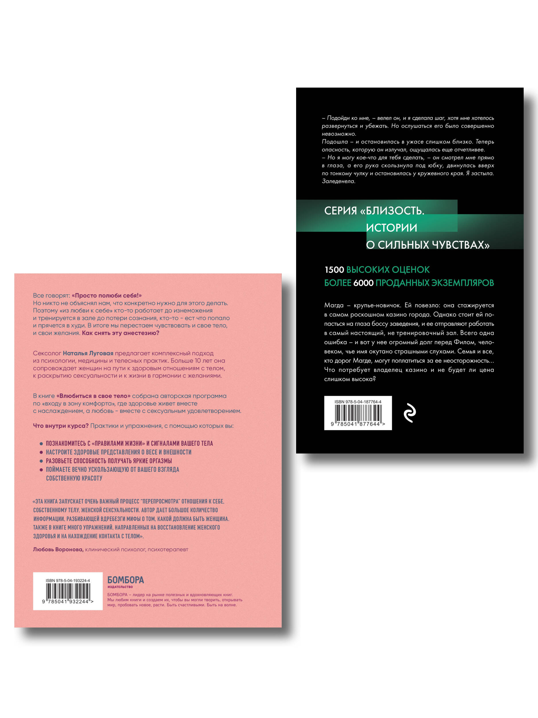 В комплект входит: Книга: «Влюбиться в свое тело. Практический курс по восстановлению здоровых отношений с телом и сексуальностью» Все говорят: «Просто полюби себя!» Но никто не объяснял нам, что конкретно нужно для этого делать. Поэтому из «любви к себе» кто-то работает до изнеможения и тренируется в зале до потери сознания, кто-то - ест что попало и прячется в худи. В итоге мы перестаем чувствовать и свое тело, и свои желания. Как снять эту анестезию? Сексолог Наталья Луговая предлагает комплексный подход из психологии, медицины и телесных практик. Больше 10 лет она сопровождает женщин на пути к здоровым отношениям с телом, к раскрытию сексуальности и к жизни в гармонии с желаниями. В книге «Влюбиться в свое тело» собрана авторская программа по «входу в зону комфорта», где здоровье живет вместе с наслаждением, а любовь - вместе с сексуальным удовлетворением. Книга «Ставка на тело» Для Магды работа крупье в лучшем казино - это отличный шанс вытащить свою семью из нищеты, а получить это место - редкостная удача. Но ее радость была недолгой. Магда совершает ошибку, и заведение теряет большие деньги. Теперь у девушки огромный долг перед владельцем - человеком, который держит в руках чужие судьбы. Игра начинается, и ставки становятся все выше… Окунитесь в атмосферу азарта и страсти вместе с книгой «Ставка на тело».| Издательство | ООО "Издательство "Эксмо" |