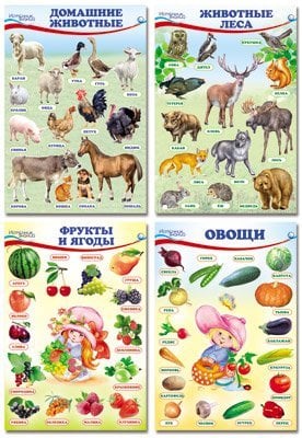 Аннотация: Комплект познавательных мини-плакатов. Домашние, лесные животные, фрукты и ягоды, овощи 4 листа А4+, текст на обороте