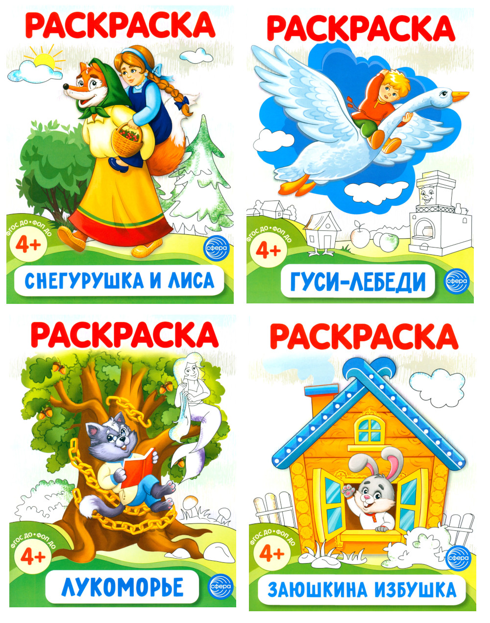 Комплект из 4 раскрасок. Состав комплекта: 1. Снегурушка и лиса. Раскраска. 2. Лукоморье. А. С. Пушкин. Раскраска. 3. Заюшкина избушка. Раскраска. 4. Гуси-лебеди. Раскраска.| Издательство | Творческий центр Сфера |