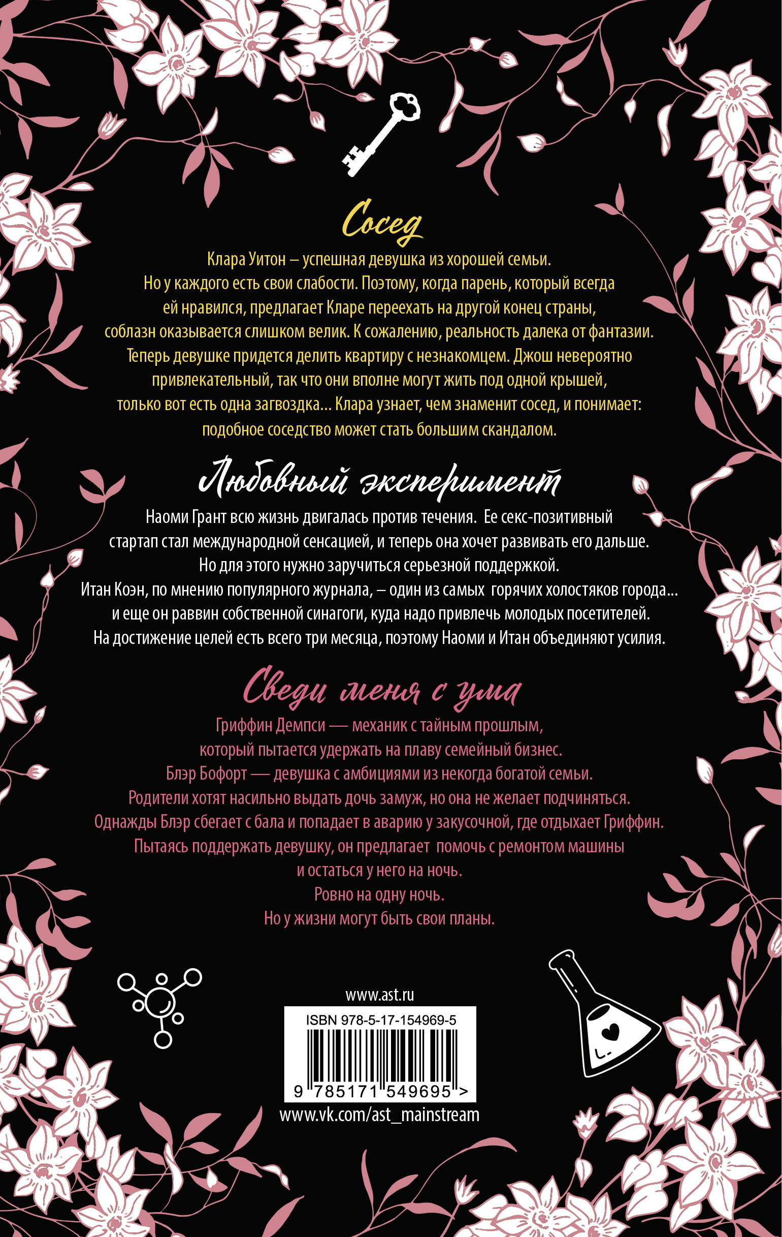 Сосеg Клара Уитон - успешная девушка из хорошей семьи. Но у каждого есть свои слабости. Поэтому, когда парень, который всегда ей нравился, предлагает Кларе переехать на другой конец страны, соблазн оказывается слишком велик. К сожалению, реальность далека от фантазии. Теперь девушке придется делить квартиру с незнакомцем. Джош невероятно привлекательный, так что они вполне могут жить под одной крышей, только вот есть одна загвоздка... Клара узнает, чем знаменит сосед, и понимает: подобное соседство может стать большим скандалом. Любовный эксперимент Наоми Грант всю жизнь двигалась против течения. Ее секс-позитивный стартап стал международной сенсацией, и теперь она хочет развивать его дальше. Но для этого нужно заручиться серьезной поддержкой. Итан Коэн, по мнению популярного журнала, - один из самых горячих холостяков города... и еще он раввин собственной синагоги, куда надо привлечь молодых посетителей. На достижение целей есть всего три месяца, поэтому Наоми и Итан объединяют усилия. Свеgи меня с ума Гриффин Демпси - механик с тайным прошлым, который пытается удержать на плаву семейный бизнес. Блэр Бофорт - девушка с амбициями из некогда богатой семьи. Родители хотят насильно выдать дочь замуж, но она не желает подчиняться. Однажды Блэр сбегает с бала и попадает в аварию у закусочной, где отдыхает Гриффин. Пытаясь поддержать девушку, он предлагает помочь с ремонтом машины и остаться у него на ночь. Ровно на одну ночь. Но у жизни могут быть свои планы| Издательство | ИЗДАТЕЛЬСТВО "АСТ" |