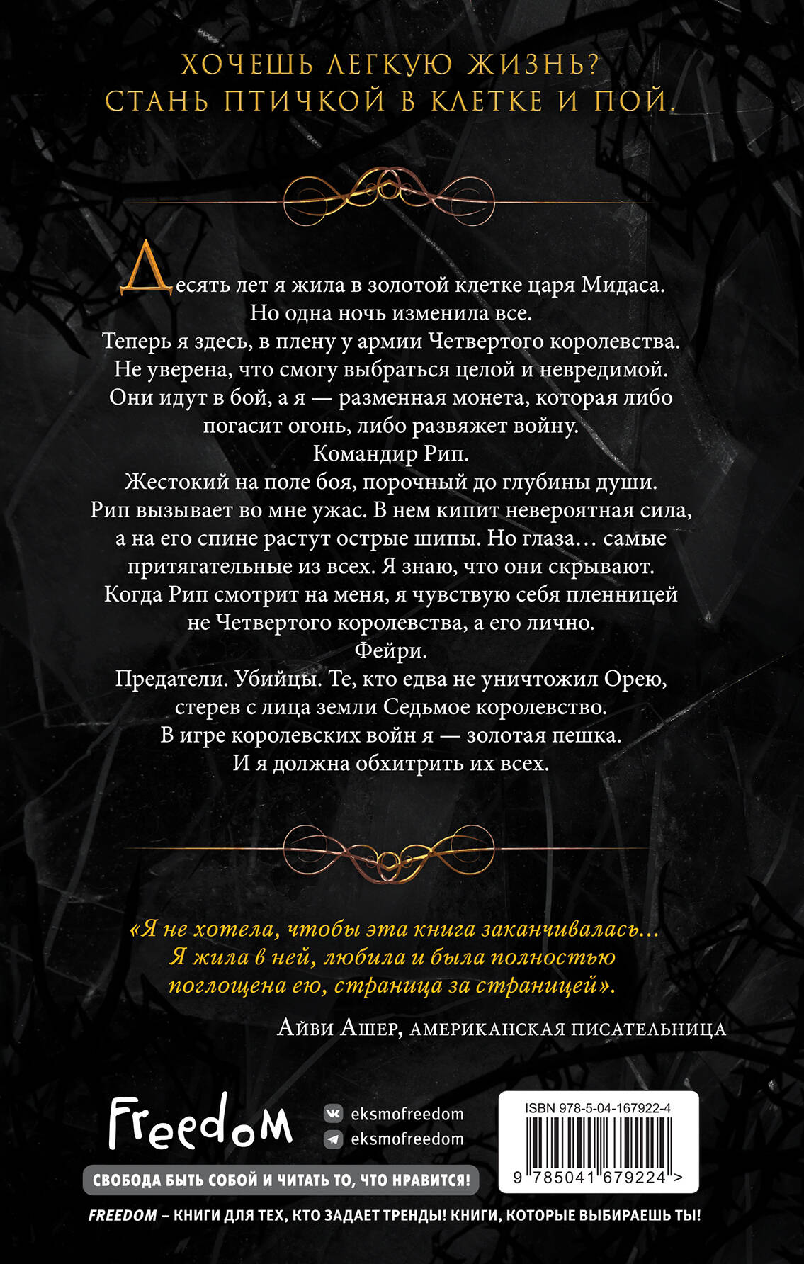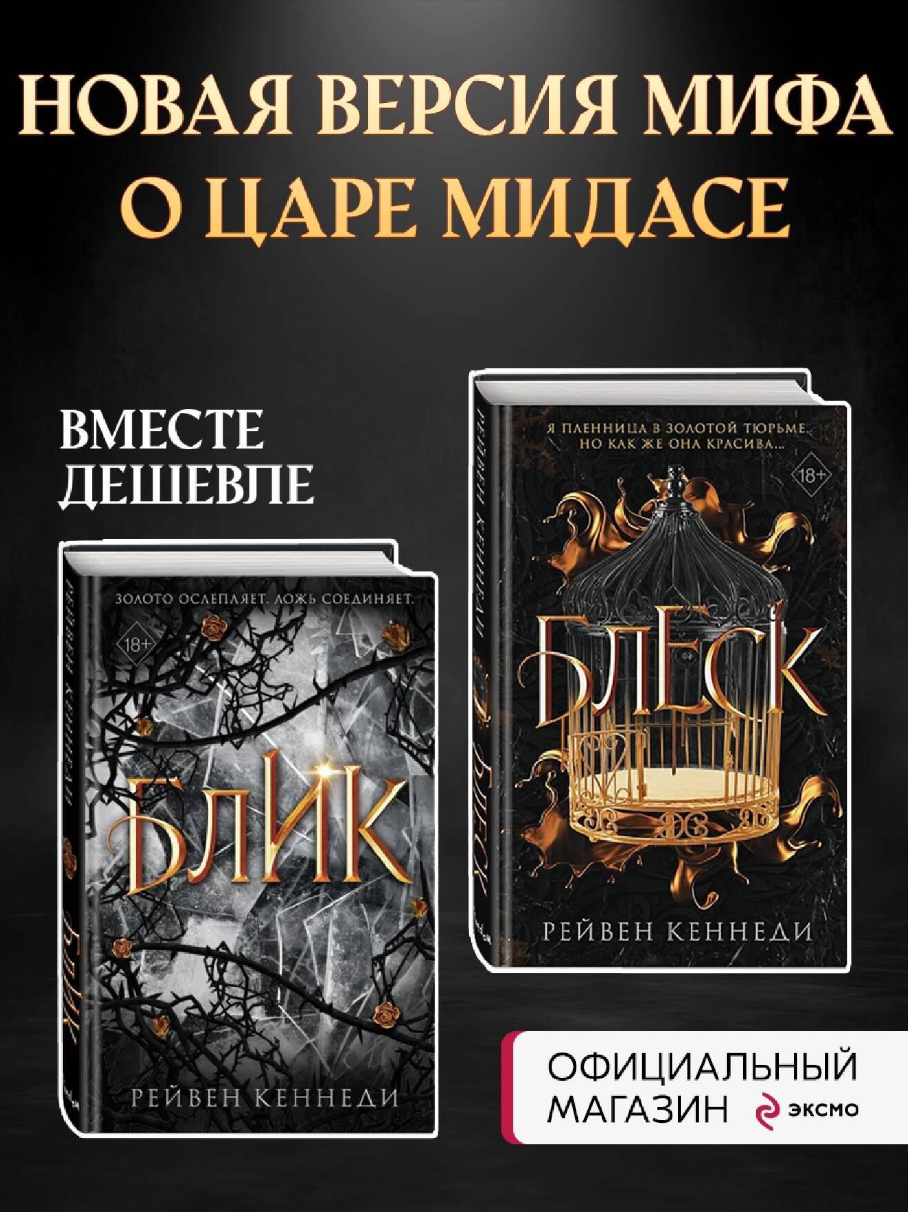 Блеск (#1) Фейри оставили этот мир нам. И править могут лишь те, кто наделен магией. Золото. Золотые полы, золотые стены, золотая мебель, золотая одежда. В замке Хайбелл из золота все. Даже я. Царь Мидас освободил меня. И тут же заточил в клетку. Меня называют его драгоценностью. Его фавориткой. Я девушка, которую он превратил в золото, чтобы показать всем свое превосходство. Та, которая принадлежит только ему. Кров и достаток в обмен на мою любовь. Мне нельзя покидать дворец. Только там безопасно. Так я думала. Пока Мидас не решил заключить сделку и развязать войну. А я стала разменной монетой в его игре. Доверия к Мидасу больше нет. Он совсем не тот, каким я видела его все это время. Настало время выбраться за пределы золотых прутьев. Посмотрим, какова будет цена расплаты… Блик (#2) Десять лет я жила в золотой клетке царя Мидаса. Но одна ночь изменила все. Теперь я здесь, в плену у армии Четвертого королевства. Не уверена, что смогу выбраться целой и невредимой. Они идут в бой, а я - разменная монета, которая либо погасит огонь, либо развяжет войну. Командир Рип. Жестокий на поле боя, порочный до глубины души. Рип вызывает во мне ужас. В нем кипит невероятная сила, а на его спине растут острые шипы. Но глаза… самые притягательные из всех. Я знаю, что они скрывают. Когда Рип смотрит на меня, я чувствую себя пленницей не Четвертого королевства, а его лично. Фейри. Предатели. Убийцы. Те, кто едва не уничтожил Орею, стерев с лица земли Седьмое королевство. В игре королевских войн я - золотая пешка. И я должна обхитрить их всех.| Издательство | ООО "Издательство "Эксмо" |