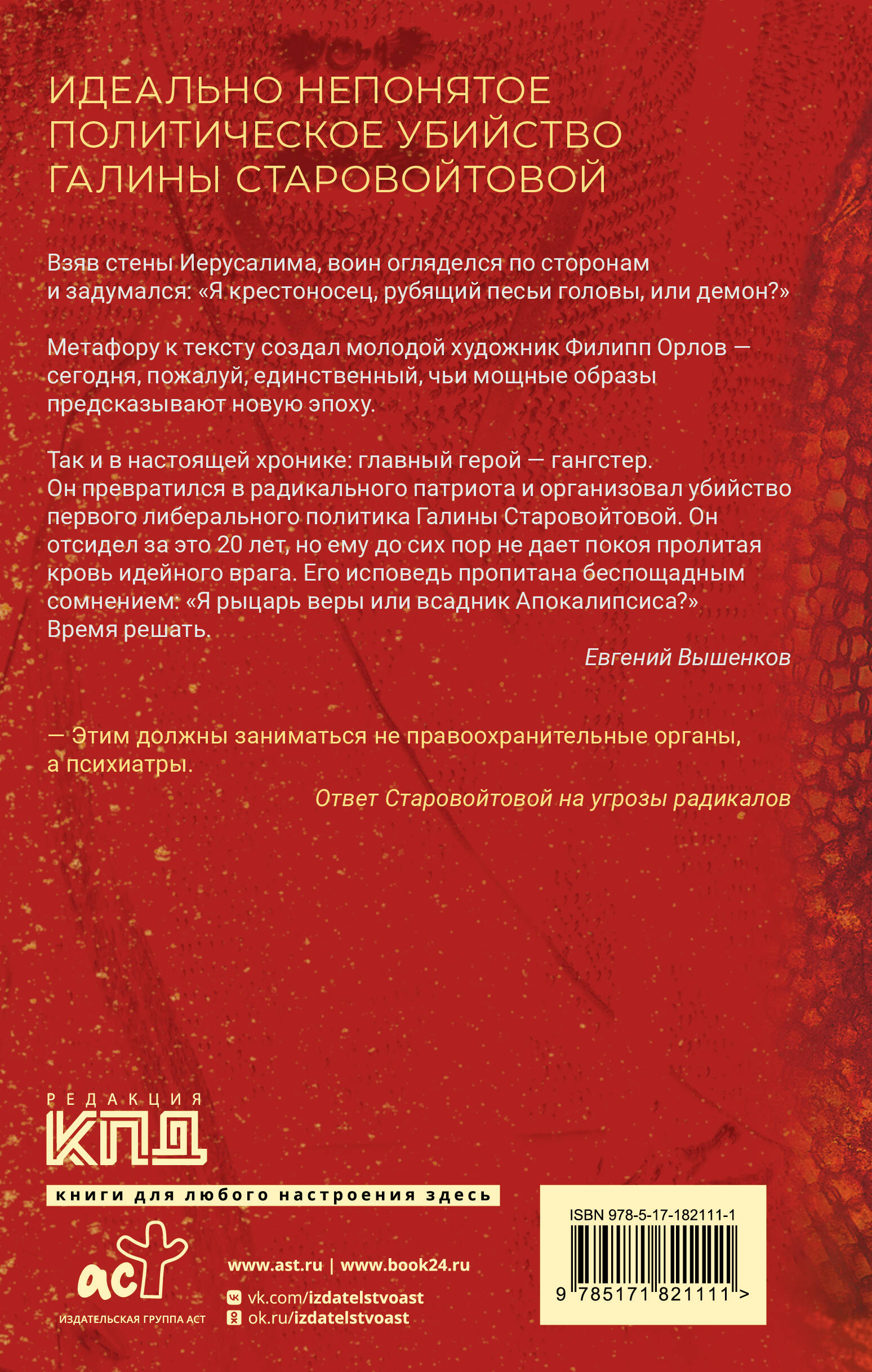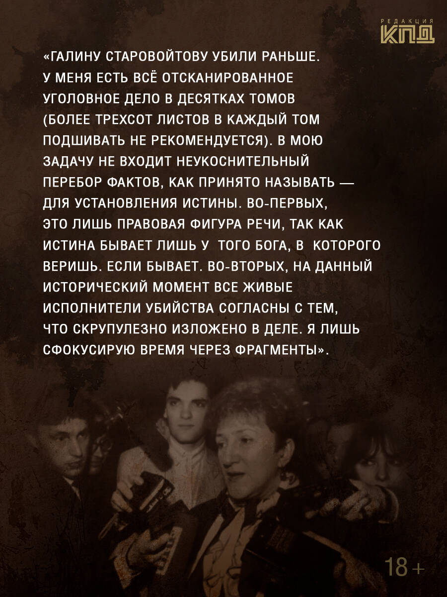 - На страницах книги собраны подлинные свидетельства, интервью, признания и аналитические выводы, раскрывающие все подробности убийства Галины Старовойтовой. - Расследование, в которой документ не скрыт, а предъявлен: автор показывает, как политическая и экономическая среда 90-х создавала антагонистических фигур разного жизненного и идеологического багажа, что не могло не привести к трагедии. - Особая линия книги - история Юрия Колчина: лидера преступной группы, убившей Галину Старовойтову. - Глубочайший анализ эпохи, поднимающийся над исследованием конкретного преступления, и предстающий перед читателем культурологическим исследованием бурных и страшных событий недавнего прошлого.| Издательство | Издательство "АСТ" |