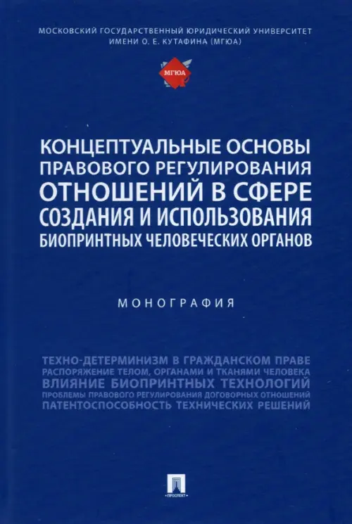 Отдельное внимание уделено частноправовым аспектам регулирования отношений в сфере создания и использования биопринтных органов и тканей человека. В частности, рассмотрены вопросы, связанные с осуществлением и защитой нематериальных прав человека, с обязательственными отношениями, а также с правами на результаты интеллектуальной деятельности в сфере биопринтных технологий.