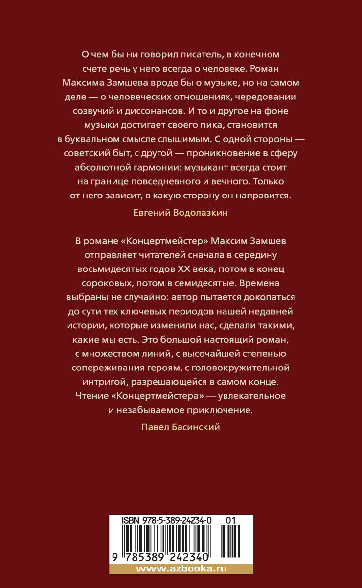 Год 1947-й. Медработник Людмила Гудкова крадет из больницы морфий для своего друга композитора Александра Лапшина. Год 1951-й. Майор МГБ Апполинарий Отпевалов арестован как причастный к деятельности врага народа, бывшего руководителя МГБ СССР Виктора Абакумова, но вскоре освобожден без объяснения причин. Год 1974-й. Органы госбезопасности СССР раскрывают сеть распространителей антисоветской литературы в городе Владимире. Год 1985-й. Пианист Арсений Храповицкий звонит в дверь собственной квартиры, где он не решался появиться более десяти лет. Каким таинственным образом связаны между собой эти события? Как перебороть себя и сохранить в себе свет, когда кругом одна тьма? Об этом и о многом другом роман Максима Замшева "Концертмейстер".| Издательство | Азбука-Аттикус Издат.группа ООО |