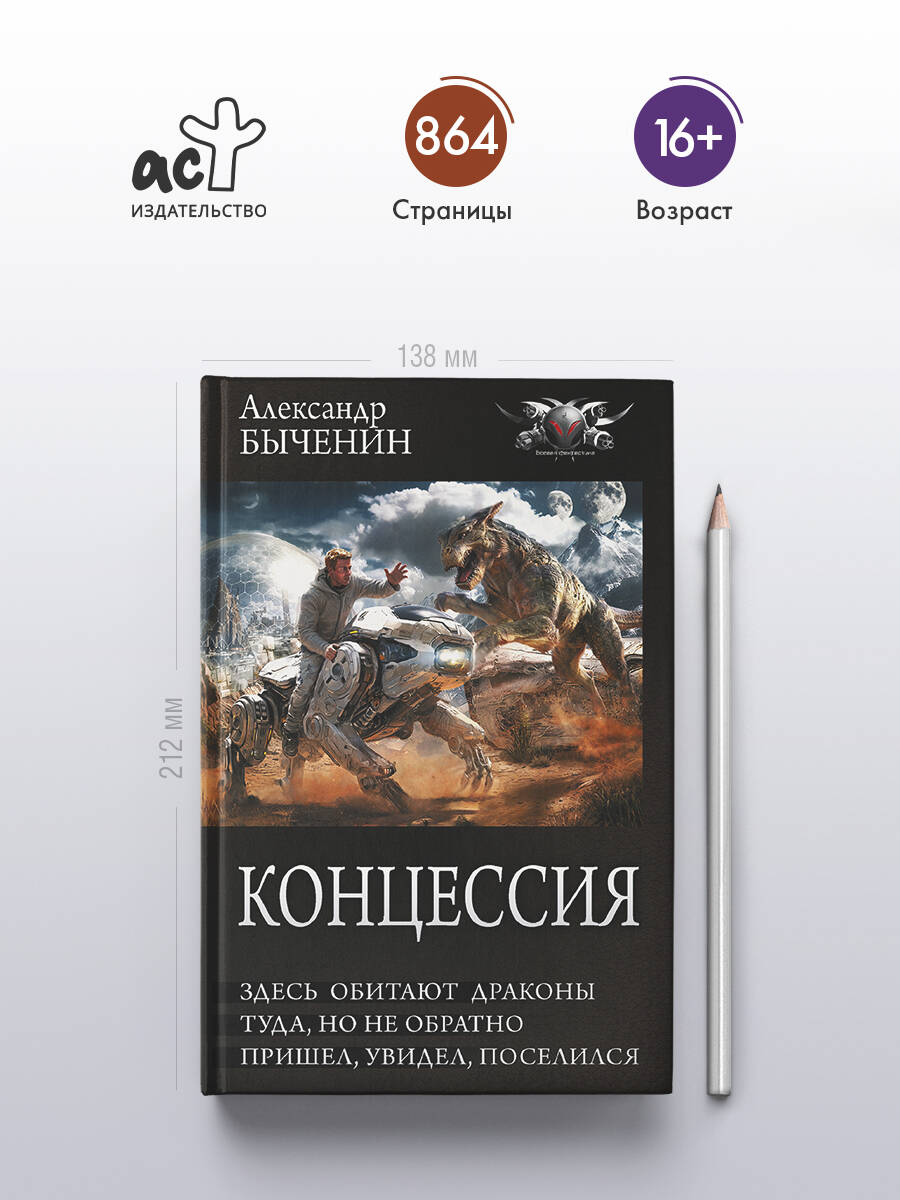- Сборник из цикла «Концессия». - В издание вошли три произведения - «Здесь обитают драконы», «Туда, но не обратно», «Пришел, увидел, поселился» - самостоятельные, но связанные общей вселенной истории о переселенцах, новых мирах и неожиданных правилах выживания. - Быченин создает насыщенные миры с продуманной культурой, необычной экосистемой и логикой развития миров. В каждой повести - собственная загадка, риск и необходимость адаптироваться в условиях, где человек - лишь гость. - Александр Быченин - инженер-механик, кандидат технических наук, автор популярных циклов научной и приключенческой фантастики. Читатели ценят его тексты за реалистичность, научную точность и сильную атмосферу «неизведанного». - Серия «Коллекция». Также в серии: Константин Денисов «Выживальщики», Юрий Валин «Окраины», Артем Каменистый «Альфа-ноль».| Издательство | Издательство "АСТ" |