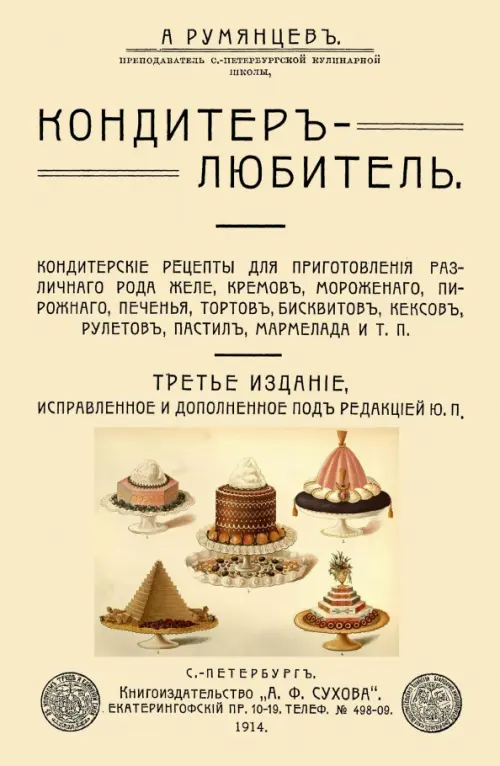 Репринт с издания с 3-го издания. Санкт-Петербург, 1914. Кондитерские рецепты для приготовления различного рода желе, кремов, мороженого, пирожного, печенья, тортов, бисквитов, кексов, рулетов, пастил, мармелада и т. п. Румянцев - преподаватель С. -Петербургской кулинарной школы. Сборник редких старинных рецептов. Тираж 30 экз. выполнен по технологии print-on-demand.