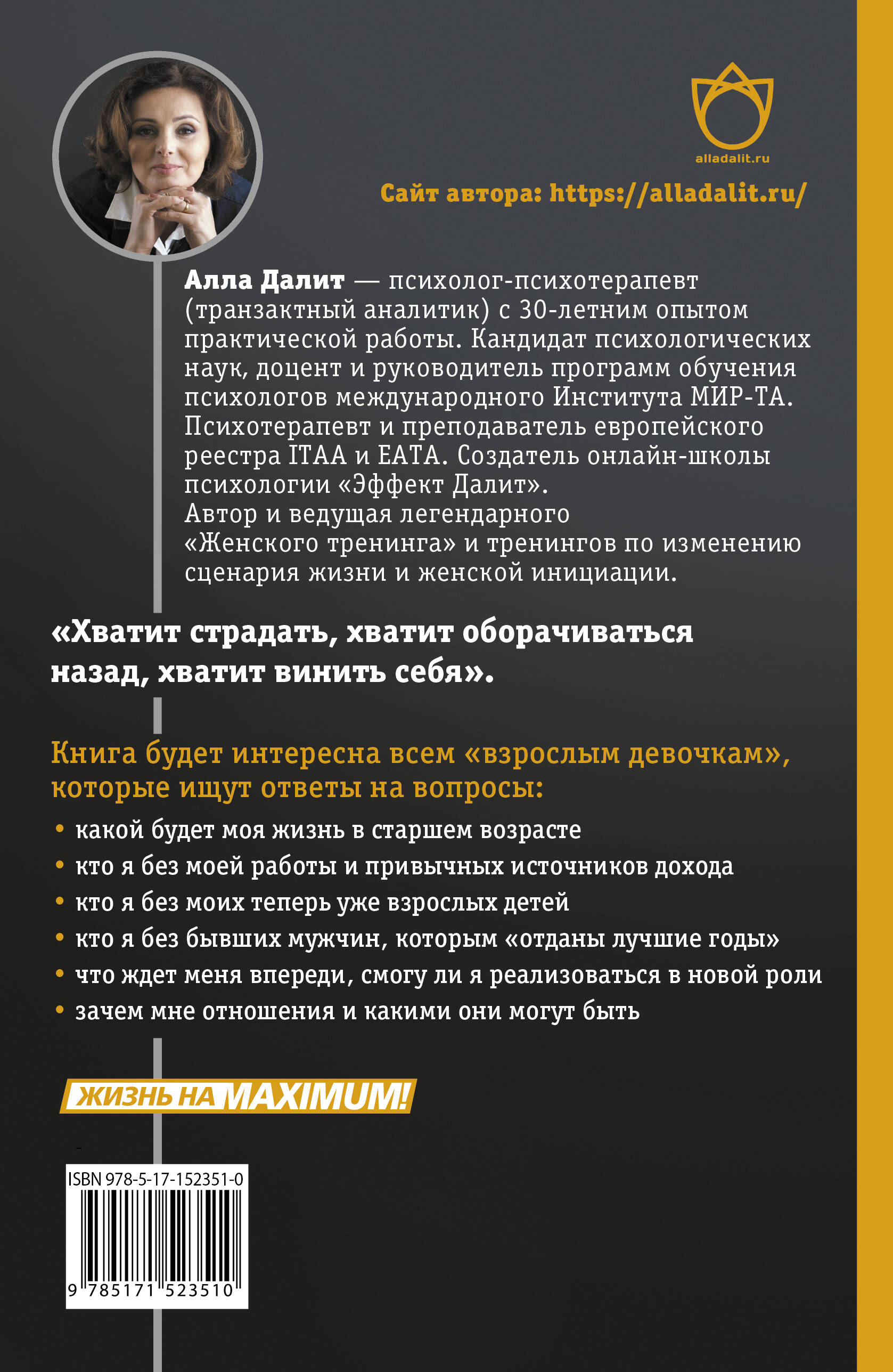 Однажды проснувшись, мы понимаем, что находимся в доме, который разваливается на глазах: не те люди, не те вещи, не то здоровье. Этот дом служил нам годами, но стал чужим, в нем нет места для нас самих, мы только отдаем "долги" семье или работе, а будущее кажется тоскливым и беспросветным. Отчаяние, чувство безысходности, уныние могут овладеть даже самыми сильными из нас, и особенно амазонками, которые "могли все". Автор книги - Алла Далит, известный психолог-психотерапевт, транзактный аналитик с многолетней практикой - проведет читательниц по тайным комнатам души и поможет осуществить в них реконструкцию, чтобы каждая из нас в любом возрасте жила полной и насыщенной жизнью! Перед вами - книга-план, которая с помощью метафор и ассоциаций поможет выбраться из плена иллюзий и начать наконец-то строить жизнь без чужих шаблонов и по собственному желанию! Книга написана как увлекательный роман, при этом содержит множество практических упражнений, которые помогут взрослым девочкам обрести свое место, научат заботиться о себе и жить в соответствии со своими желаниями и ресурсами! Книга будет интересна всем "взрослым девочкам", а особенно тем, кто ищет ответы на вопросы: "какой будет моя жизнь в старшем возрасте", "кто я без моей работы, без моих теперь уже взрослых детей, без бывших мужей, которым "отданы лучшие годы", без привычных источников дохода", "как жить, если не видишь себя бабушкой, нянчащей внуков или пропалывающей грядки", "что ждет меня впереди", "смогу ли я реализоваться в новой роли - и какая это роль", "зачем мне отношения и какими они могут быть".| Издательство | ИЗДАТЕЛЬСТВО "АСТ" |