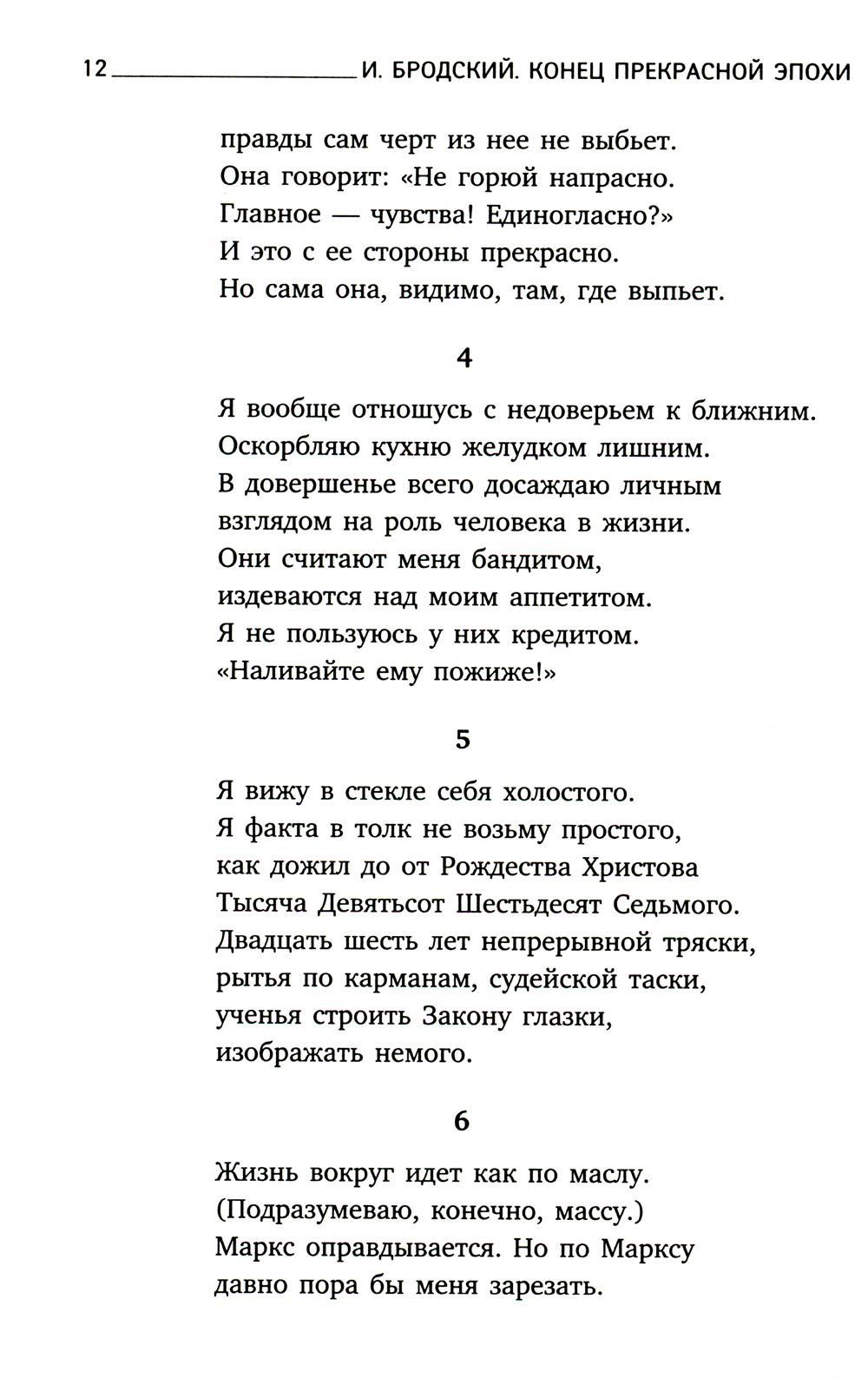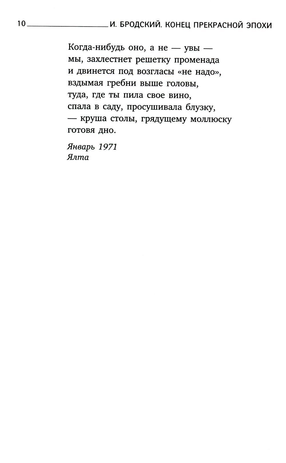 Сборники стихотворений Иосифа Бродского (1940-1996) «Остановка в пустыне», «Конец прекрасной эпохи», «Часть речи», «Новые стансы к Августе», «Урания» и «Пейзаж с наводнением» были опубликованы в 1970-90-е годы в американском издательстве «Ардис», где много лет выходили произведения русской литературы, которые не могли увидеть свет на родине. Бродский писал, что это издательство спасло многочисленных русских писателей и поэтов от забвения и изменило сам климат русской литературы. В сборник «Конец прекрасной эпохи» вошли стихотворения конца 1960 - начала 1970-х годов, среди которых «Речь о пролитом молоке», «Посвящается Ялте», «Разговор с небожителем», «Литовский дивертисмент» и другие.| Издательство | Лениздат |
