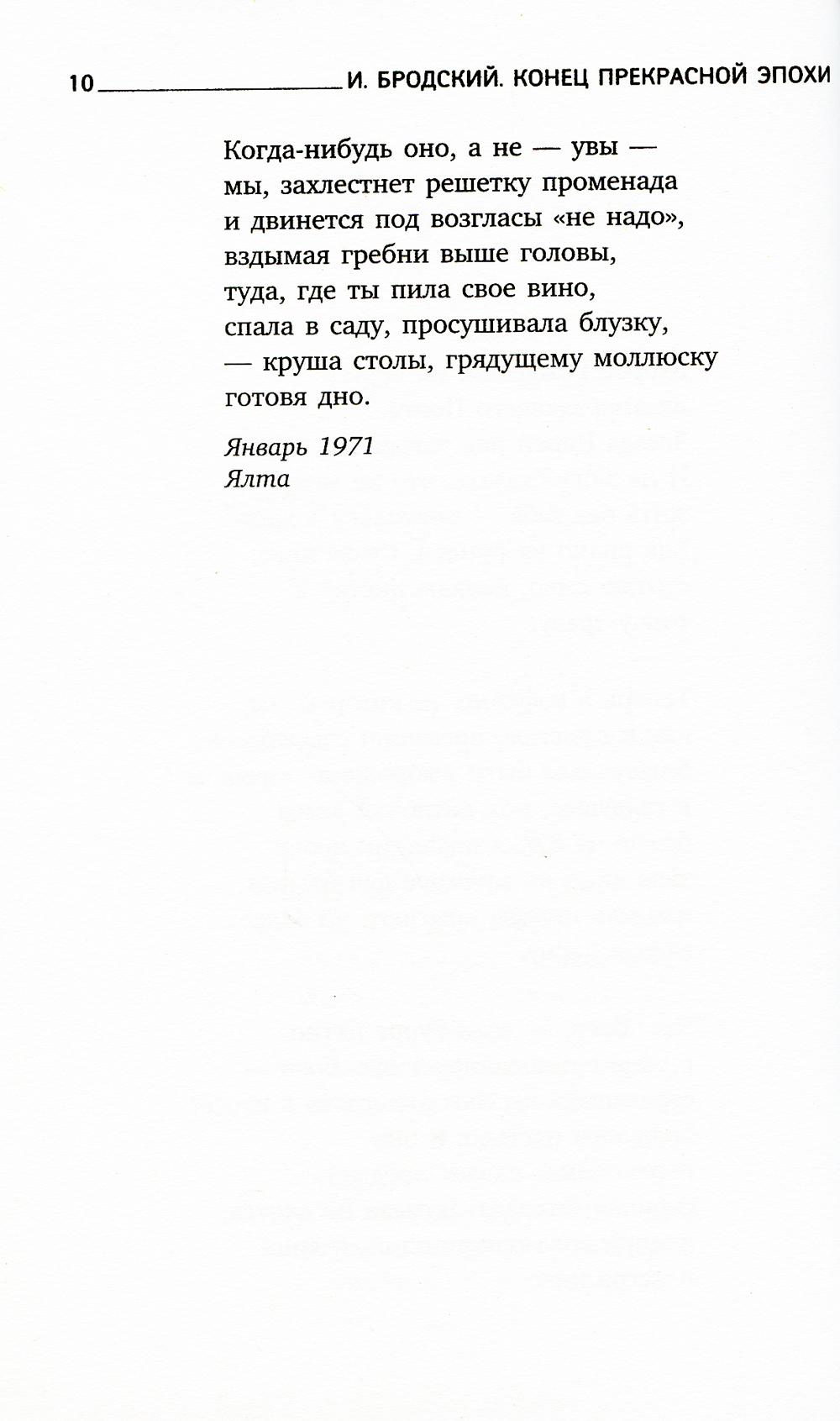 Сборники стихотворений Иосифа Бродского (1940-1996) «Остановка в пустыне», «Конец прекрасной эпохи», «Часть речи», «Новые стансы к Августе», «Урания» и «Пейзаж с наводнением» были опубликованы в 1970-90-е годы в американском издательстве «Ардис», где много лет выходили произведения русской литературы, которые не могли увидеть свет на родине. Бродский писал, что это издательство спасло многочисленных русских писателей и поэтов от забвения и изменило сам климат русской литературы. В сборник «Конец прекрасной эпохи» вошли стихотворения конца 1960 - начала 1970-х годов, среди которых «Речь о пролитом молоке», «Посвящается Ялте», «Разговор с небожителем», «Литовский дивертисмент» и другие.| Издательство | Лениздат |