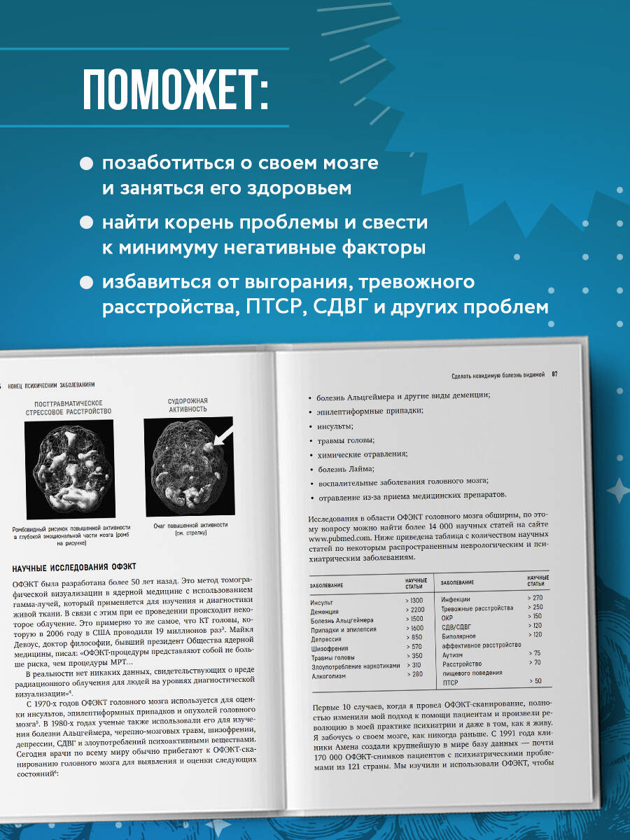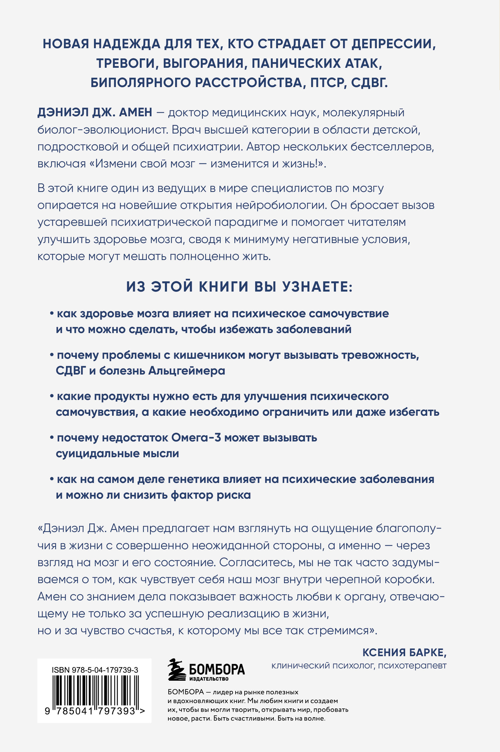 Кажется, что «психическое заболевание» - это клеймо, которое останется на всю жизнь, и отказаться от лечения будет уже невозможно. Но на самом деле это не так: выход есть, даже если у вас депрессия, тревога, панические атаки, биполярное расстройство, ПТСР, СДВГ. В этой книге один из ведущих в мире специалистов по мозгу и автор бестселлеров доктор Дэниэл Дж. Амен опирается на новейшие открытия нейробиологии. Он бросает вызов устаревшей психиатрической парадигме и помогает читателям улучшить здоровье мозга, сводя к минимуму негативные условия, которые могут мешать полноценно жить. Доктор Амен в своей практике не раз сталкивался с тем, что психический диагноз поставлен неверно, и на самом деле депрессия, тревожность и многое другое могут быть симптомами травмы, аллергии, неправильного образа жизни, плохой экологии. И если человек найдет источник проблемы и будет лечить мозг, то исчезнет и психический диагноз. Вы узнаете: - как здоровье мозга влияет на психическое самочувствие и что можно сделать, чтобы избежать заболеваний; - почему проблемы с кишечником могут вызывать тревожность, СДВГ и болезнь Альцгеймера; - какие продукты нужно есть для улучшения психического самочувствия, а какие необходимо ограничить или даже избегать; - почему недостаток Омега-3 может вызывать суицидальные мысли; - как на самом деле генетика влияет на психические заболевания и можно ли снизить фактор риска. Книга будет интересна не только массовому читателю, но и специалистам. Об авторе Дэниэл Дж. Амен - доктор медицинских наук, молекулярный биолог-эволюционист, занимается изучением генов, участвующих в развитии мозга. Врач высшей категории в области детской, подростковой и общей психиатрии, бывший военный психиатр. Трижды признан одним из лучших преподавателей в университетах США. Автор нескольких бестселлеров, в том числе «Измени свой мозг - изменится и жизнь!».| Издательство | ООО "Издательство "Эксмо" |