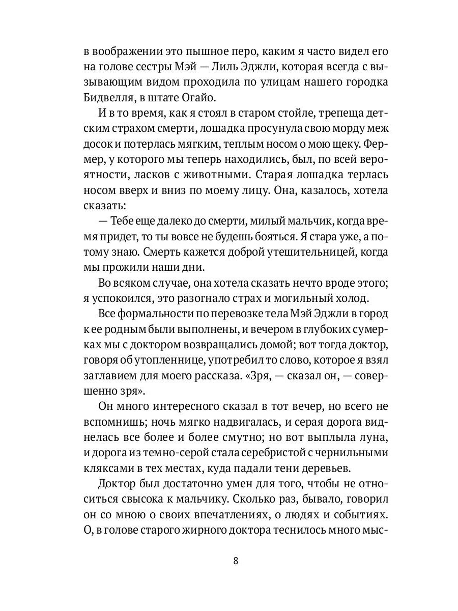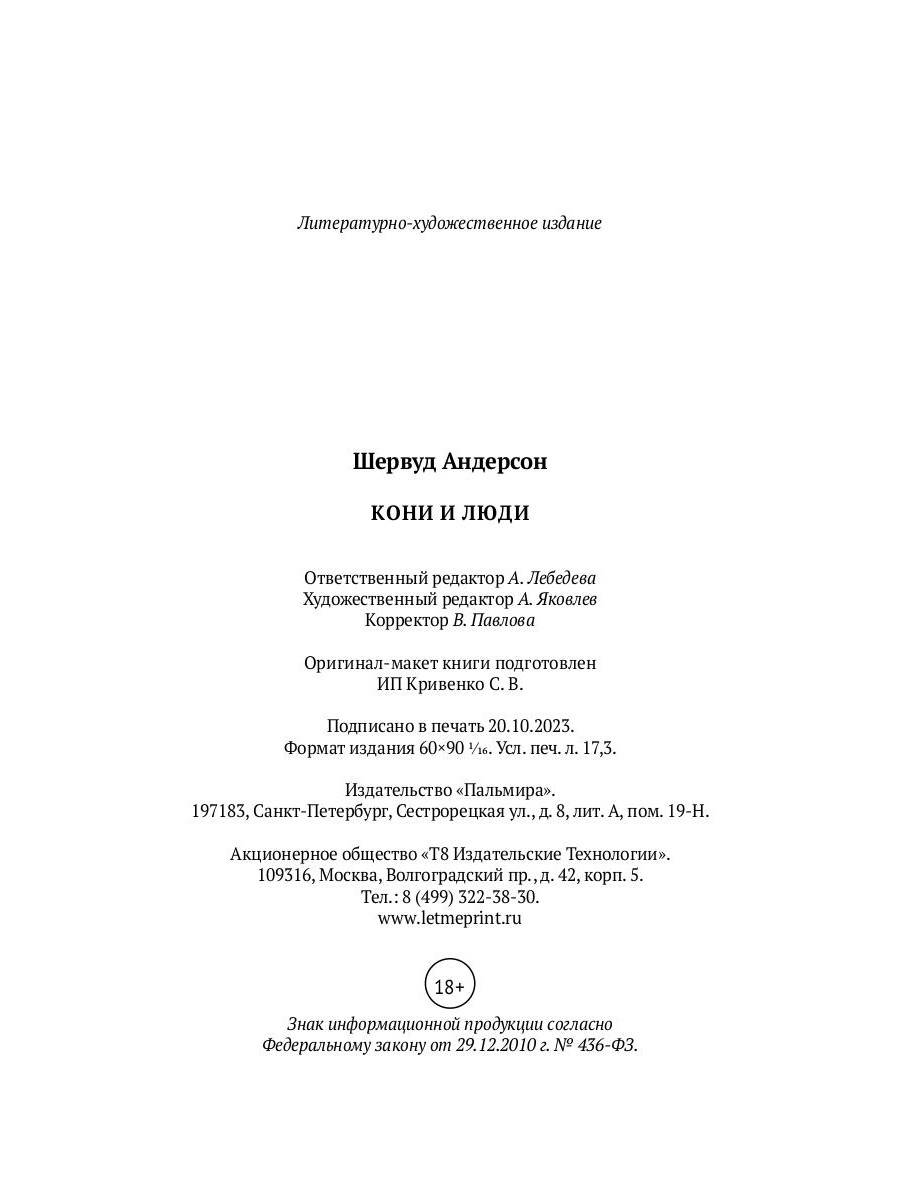 Американский прозаик Шервуд Андерсон (1876-1941) для своего времени оказался странным писателем. В эпоху, когда в литературе США господствовал «нежный реализм» с его традицией сугубо нравственного подхода к изображению жизни, Андерсон стал писать об исполненной противоречий внутренней жизни человека, одновременно избегая какой-либо дидактики и детерминистских объяснений в духе социальных теорий. Огромным успехом писателя стал его первый сборник рассказов «Уайнсбург, Огайо» (1919). Живописуя быт американской провинции, не затронутой историческими проблемами и катаклизмами и существующей как бы вне времени, Андерсон избежал всякой идеализации. Его герои мучимы одиночеством и тоской, причем это страдание нисколько не обусловлено внешними причинами - такова участь человека вообще. Мир полон таинственных веяний воздуха, необъяснимой грусти, растворенной в пейзажах, в доносящихся издалека звуках; жизнь как таковая состоит из тонких, трудноопределимых и беспричинных эмоций. Для фиксации столь тонких ощущений Андерсон создал новый жанр - не рассказ и не роман, а роман из рассказов, случайно начатых и случайно оборванных, скрепленных едва уловимыми лейтмотивами и внутренними рифмами. Сборник рассказов «Кони и люди» (1923) продолжает и развивает эти достижения автора. Проводящие читателя в глубь будничной жизни, полной неизъяснимого, произведения Андерсона оказали значительное влияние на творчество Э. Хемингуэя и У. Фолкнера и, шире, на развитие всей психологической прозы XX века.| Издательство | Т8 RUGRAM |