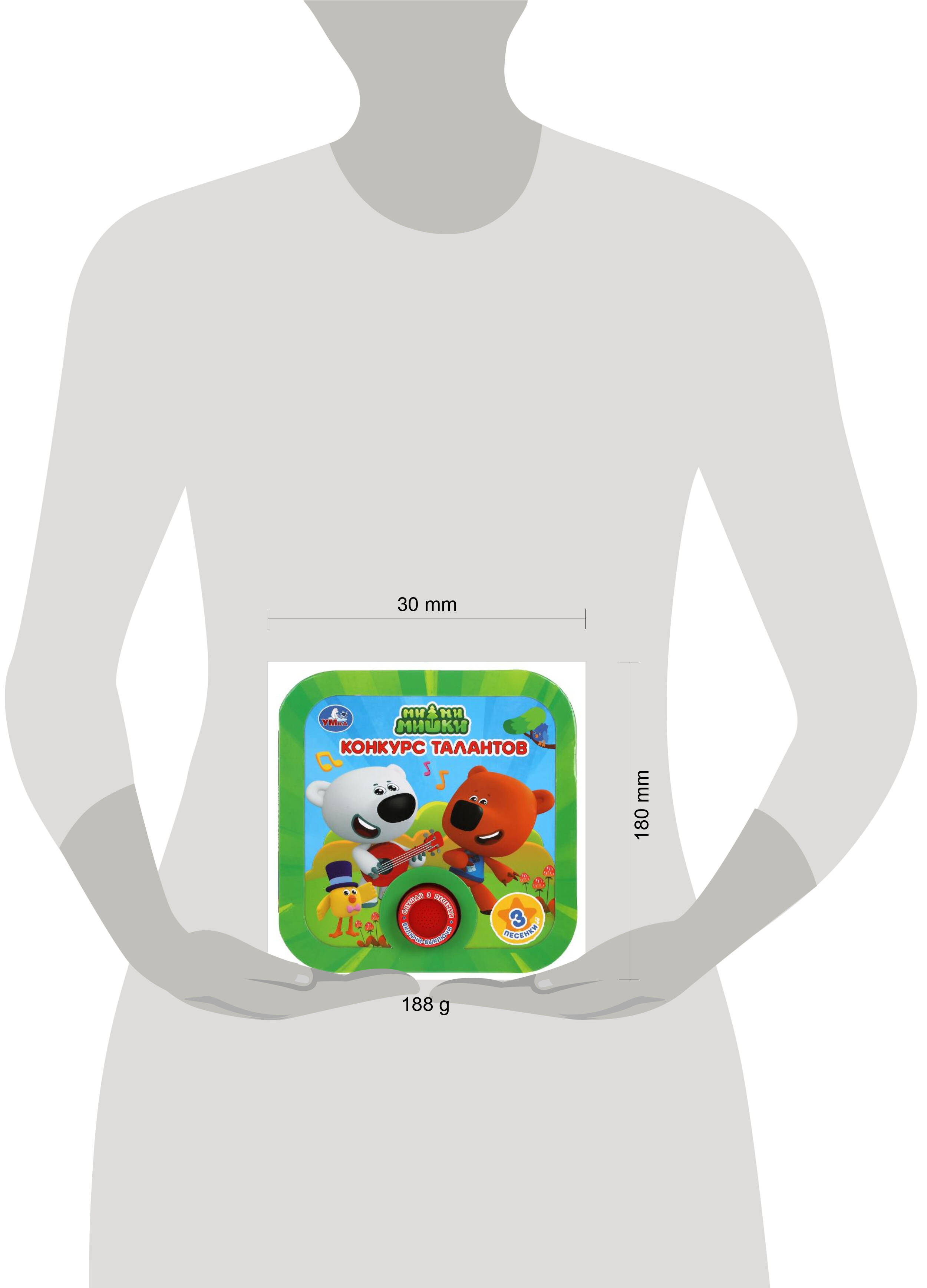 Музыкальная книга "Ми-ми-мишки. Конкурс талантов" ТМ "УМка" станет прекрасным подарком для маленьких поклонников известного мультсериала про весёлых медвежат и их друзей: - 1 звуковая кнопка - 3 песенки из м/ф: "Ми-ми-мишки", "Классная песня", "Песня Тучки" - увлекательный сюжет - яркие иллюстрации - оригинальный дизайн с рамкой - удобный формат Ребёнок с удовольствием будет листать плотные страницы, рассматривать яркие картинки, вместе с родителями читать про приключения любимых персонажей и, конечно, нажимать на кнопку и слушать весёлые песенки. Малыш легко освоит включение звука: по нажатию на кнопку песенка включится, при втором нажатии выключится. Благодаря компактному размеру книгу удобно взять с собой в дорогу. Музыкальная книга ТМ "УМка" развивает: - слуховое восприятие - навык чтения - фантазию - образное мышление - память Объём: 8 стр. Формат: 180 х 180 мм. Материал: пластмасса + картон. Работает от 3-х батареек типа LR1130 (в комплекте). Рекомендовано детям старшего дошкольного возраста.| Издательство | С-Маркет ООО |