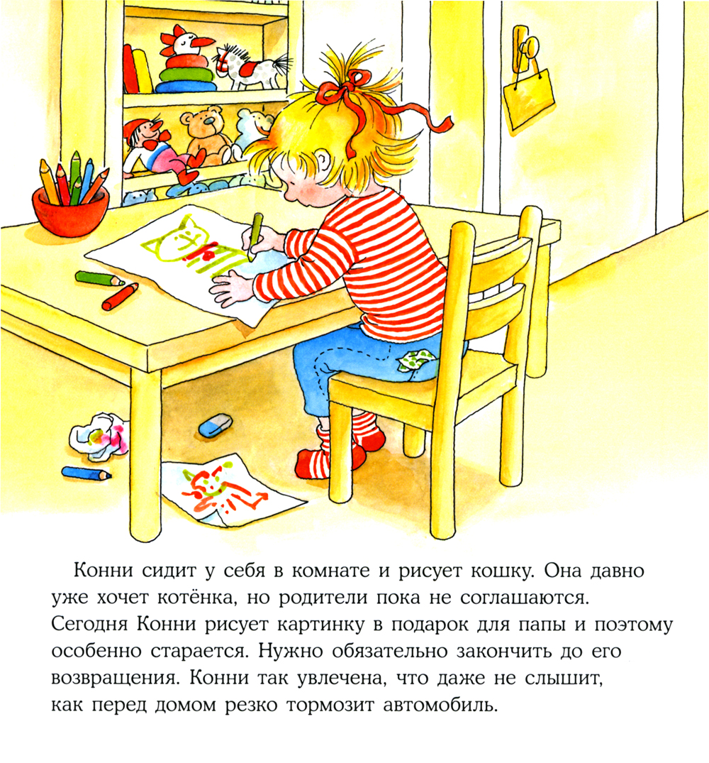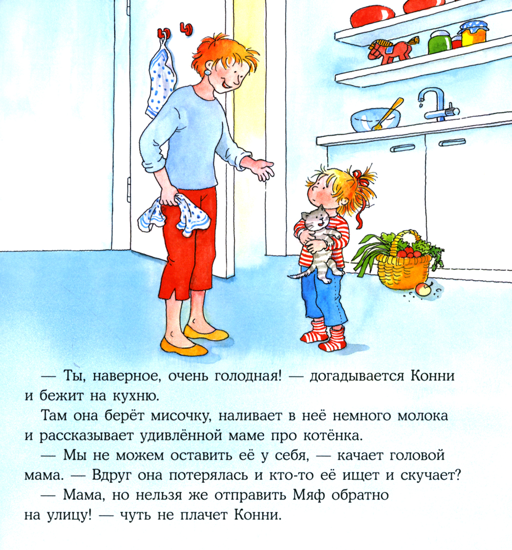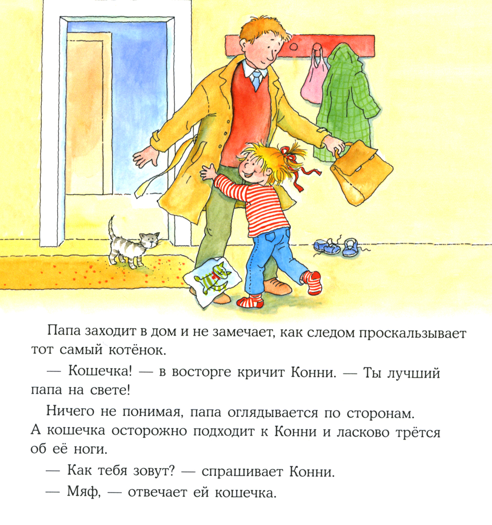 Конни Клавитгер живёт с мамой и папой в небольшом немецком городке. Ей три года, она совсем недавно начала ходить в детский сад и мечтает о домашнем животном. И вот однажды её мечта сбывается - к ней в дом попадает потерявшийся котёнок. Сможет ли Конни оставить его у себя? Или надо обязательно найти хозяина? Чем кормить котёнка, где устроить ему «домик» и как следить за его здоровьем? Прочитайте историю Конни и научитесь вместе с ней ухаживать за домашними животными.