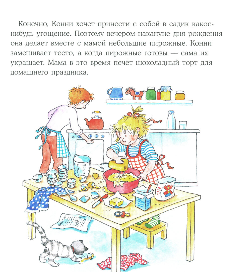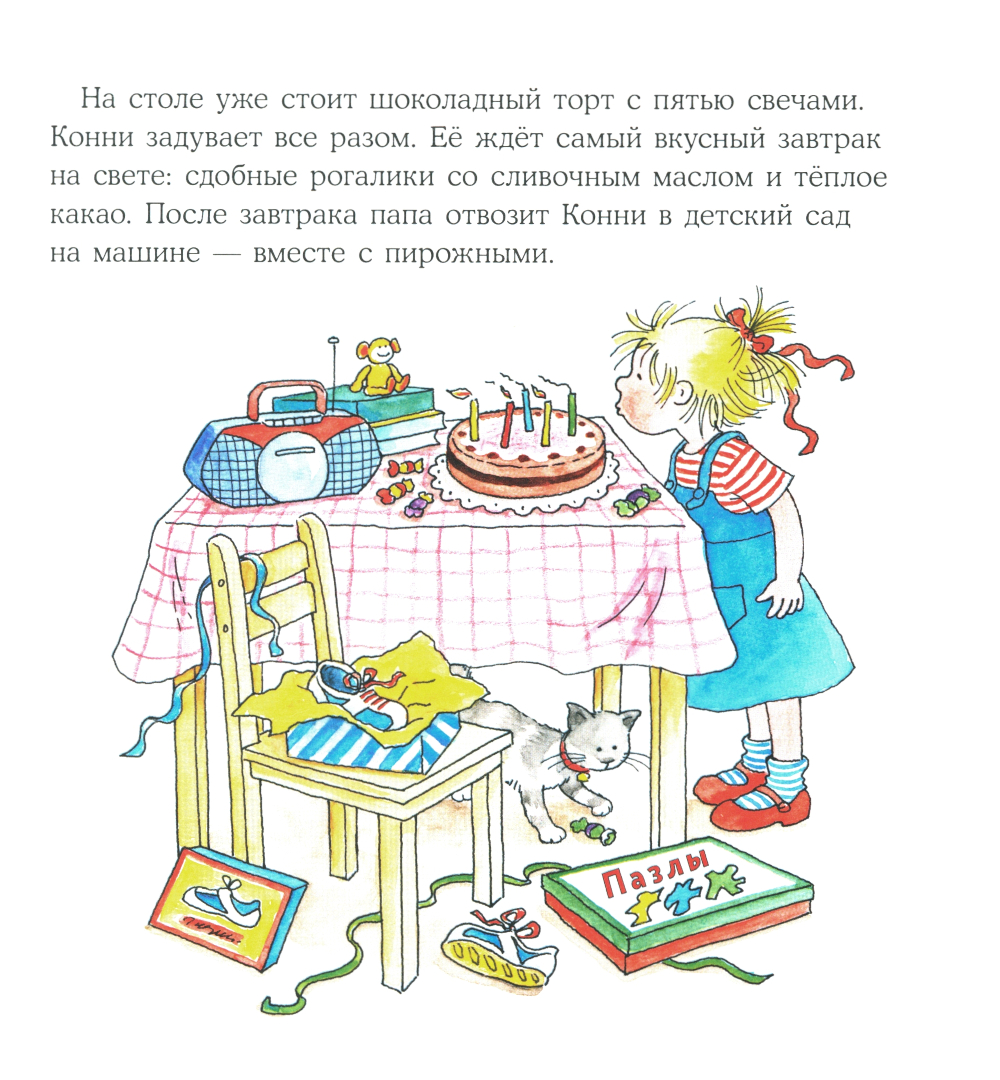 День рождения - самый важный праздник в году. Даже важнее Нового года! Вот и Конни исполняется целых пять лет! Весь день проходит в хлопотах: сначала нужно угостить пирожными ребят в детском саду, потом помочь маме украсить квартиру и, конечно, встретить гостей. Веселитесь вместе с любимой героиней и подготовьтесь ко дню рождения вашего малыша.| Издательство | Альпина Паблишер |