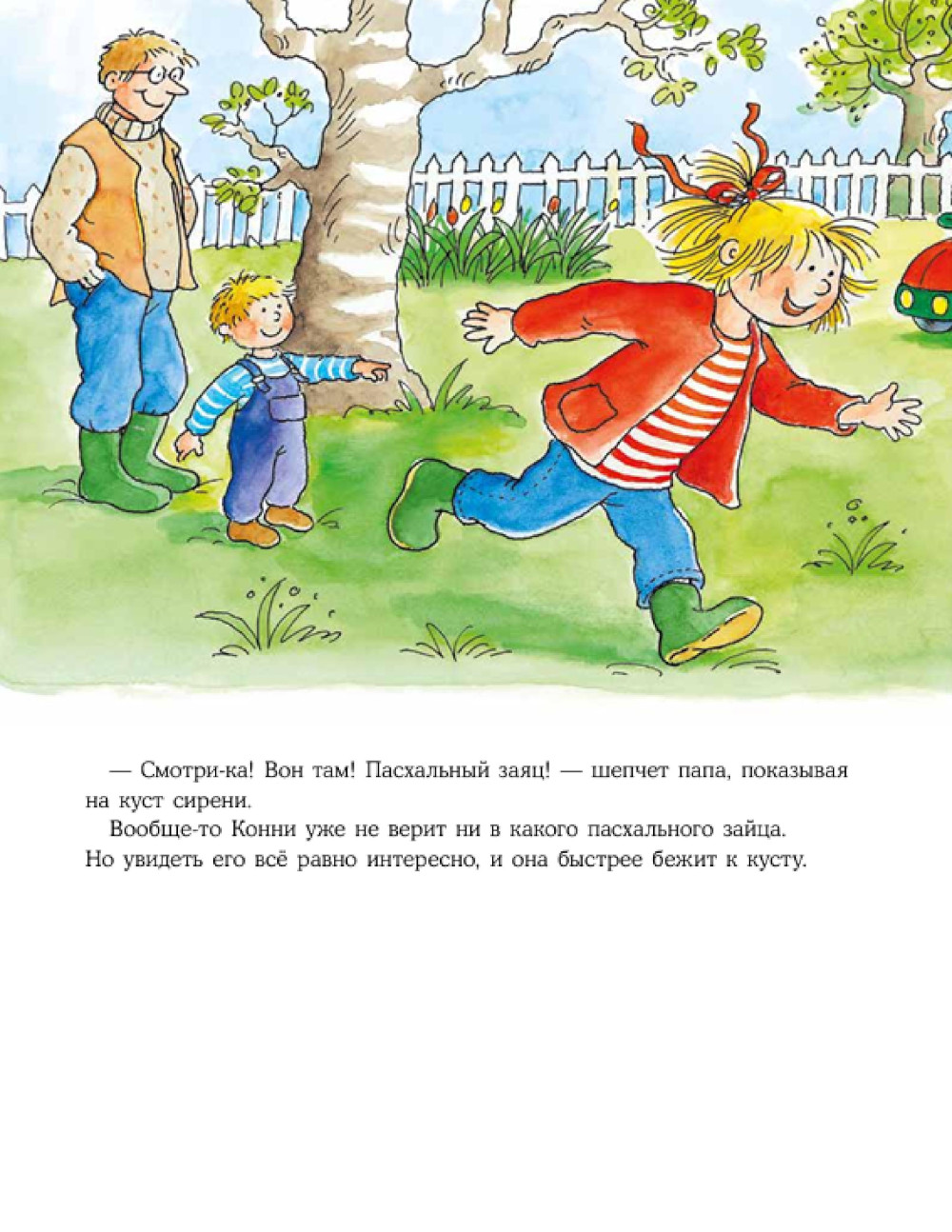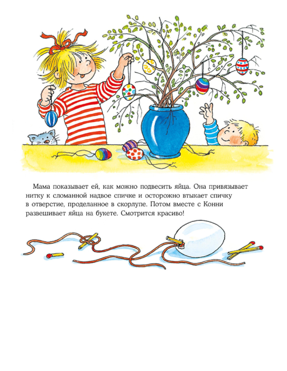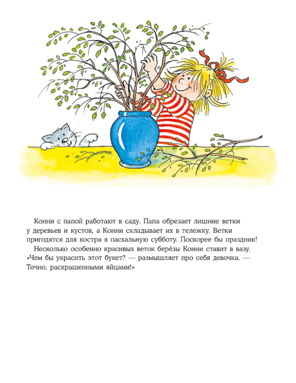 В городке Конни все готовятся к празднованию Пасхи: украшают дома, собирают ветки для общего пасхального костра и раскрашивают яйца. Конни тоже не отстаёт и устраивает на окне маленький садик с домашней зеленью. Но праздник чуть не заканчивается бедой: в кучу веток, собранных для костра, забрался маленький заяц и не решался убежать, даже когда огонь разгорелся. К счастью, ребята заметили зверушку и спасли! Эта история станет хорошим поводом обсудить с ребёнком традиции другой страны, придумать весенние украшения для дома и вспомнить, что надо внимательно относиться к природе, если вы отмечаете что-то на свежем воздухе.