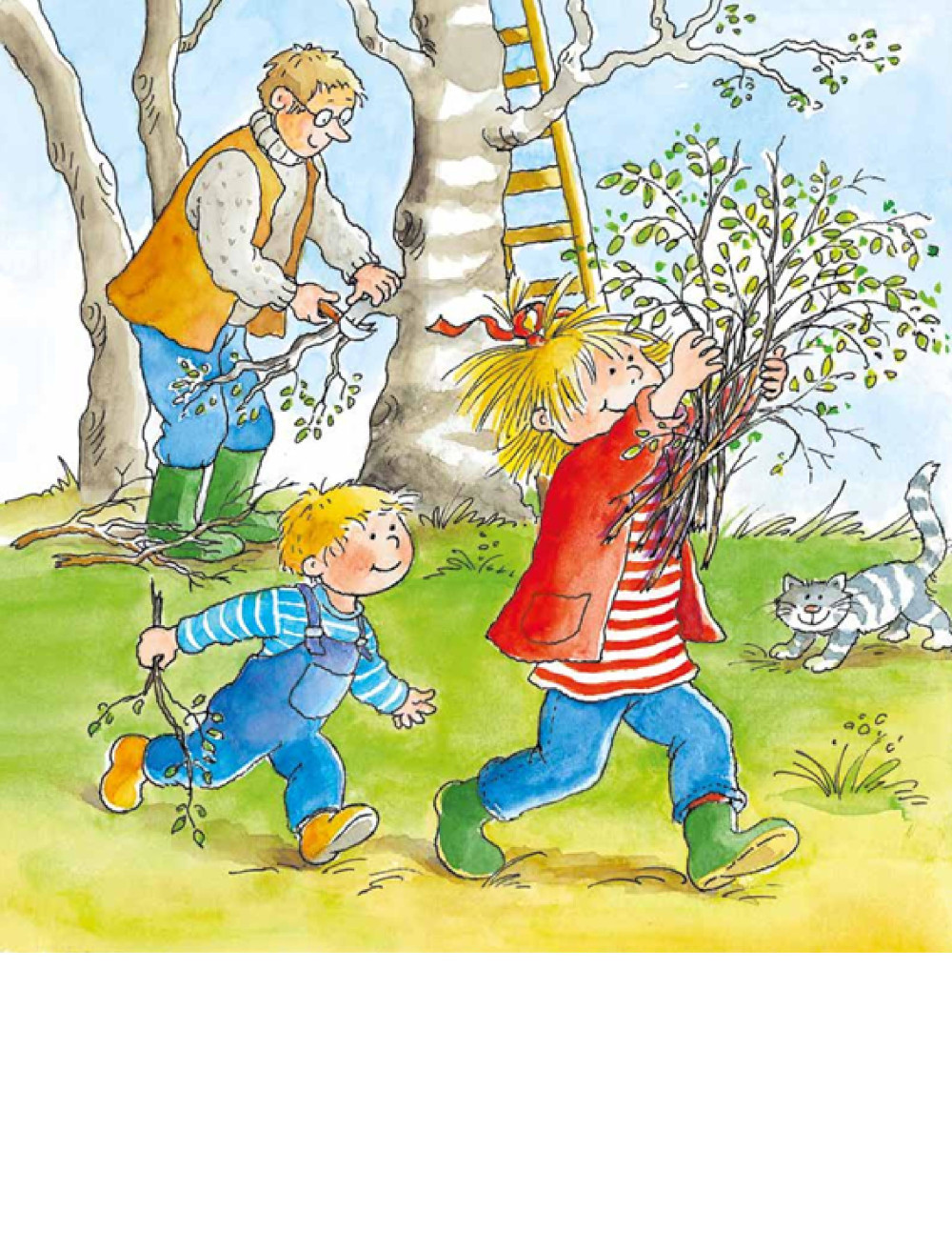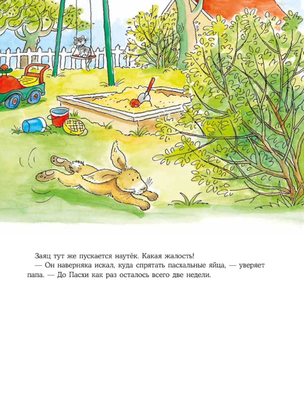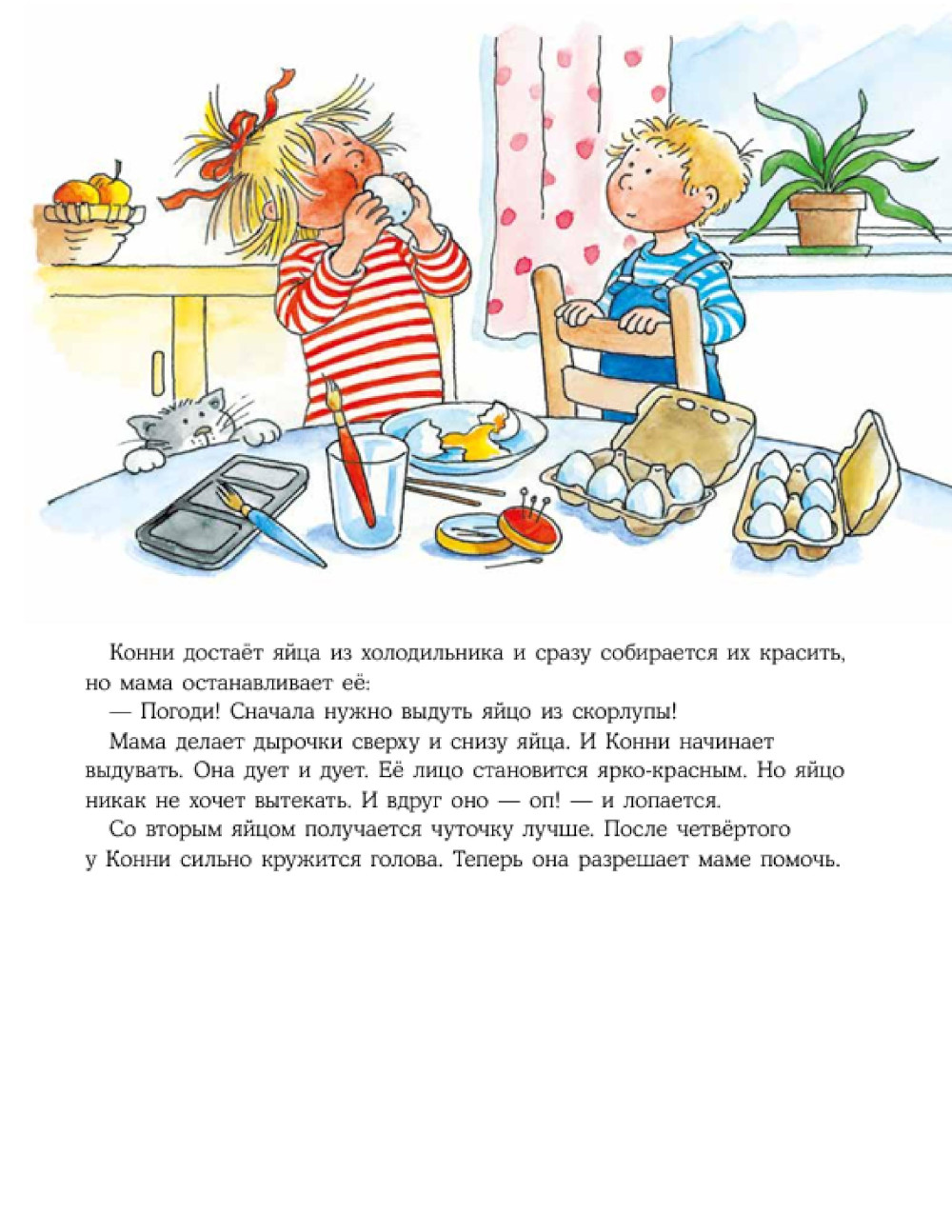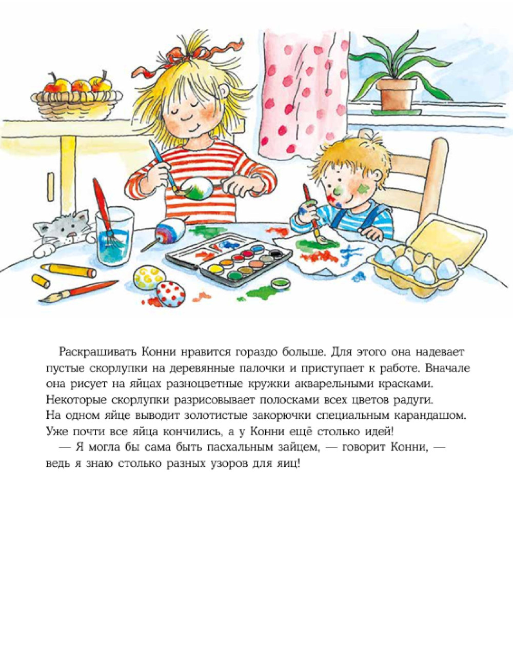 В городке Конни все готовятся к празднованию Пасхи: украшают дома, собирают ветки для общего пасхального костра и раскрашивают яйца. Конни тоже не отстаёт и устраивает на окне маленький садик с домашней зеленью. Но праздник чуть не заканчивается бедой: в кучу веток, собранных для костра, забрался маленький заяц и не решался убежать, даже когда огонь разгорелся. К счастью, ребята заметили зверушку и спасли! Эта история станет хорошим поводом обсудить с ребёнком традиции другой страны, придумать весенние украшения для дома и вспомнить, что надо внимательно относиться к природе, если вы отмечаете что-то на свежем воздухе.