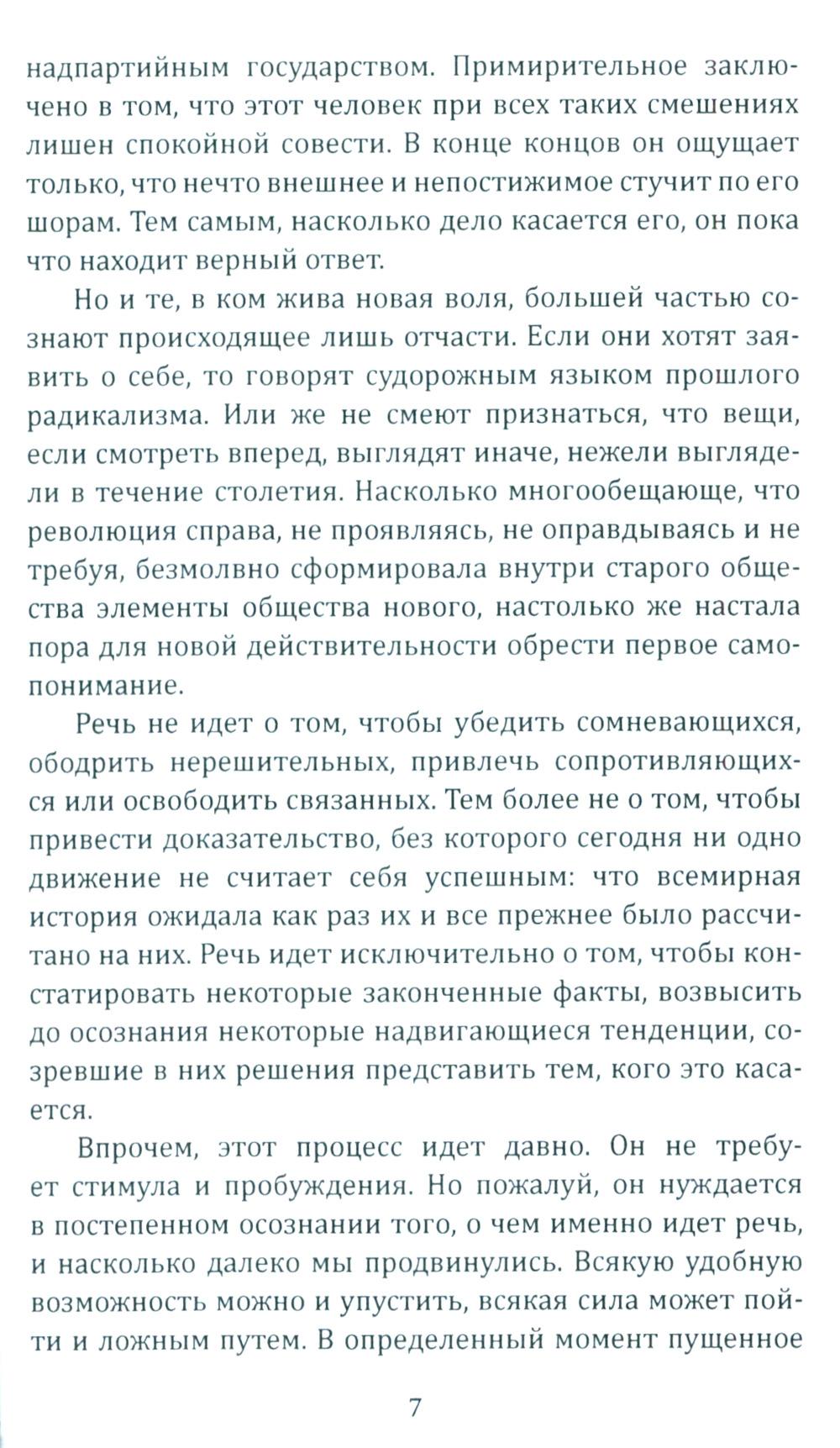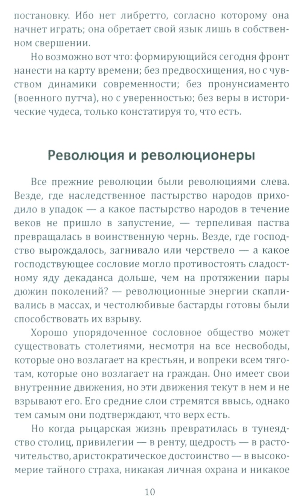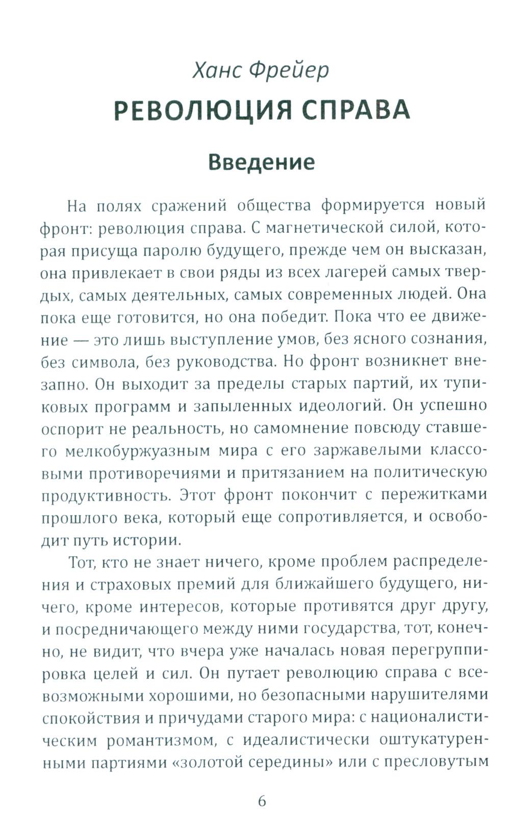 «Эта революция протекает через государство, она формируется в нем и из него обрушивается на общество, - пишет Ханс Фрейер (1887 - 1969), один из главных идеологов "консервативной революции". - Народ пробуждается к политической жизни: он начинает наступление на отжившие принципы, владеющие современностью». «Не изменяя ничего, изменить всё», - таким должен быть лозунг этой революции, а государство должно играть ключевую роль в преодолении противоречий гражданского общества и формировании новой исторической общности - «народа». Об этом же пишет Эрнст Юнгер (1895 - 1998), также один из главных теоретиков консерватизма. Для его работ характерны ориентация на автаркийное развитие страны, идея справедливого общества, основанного на принципе солидарности, сочетание традиционной культуры с передовой технической мыслью.| Издательство | Родина |