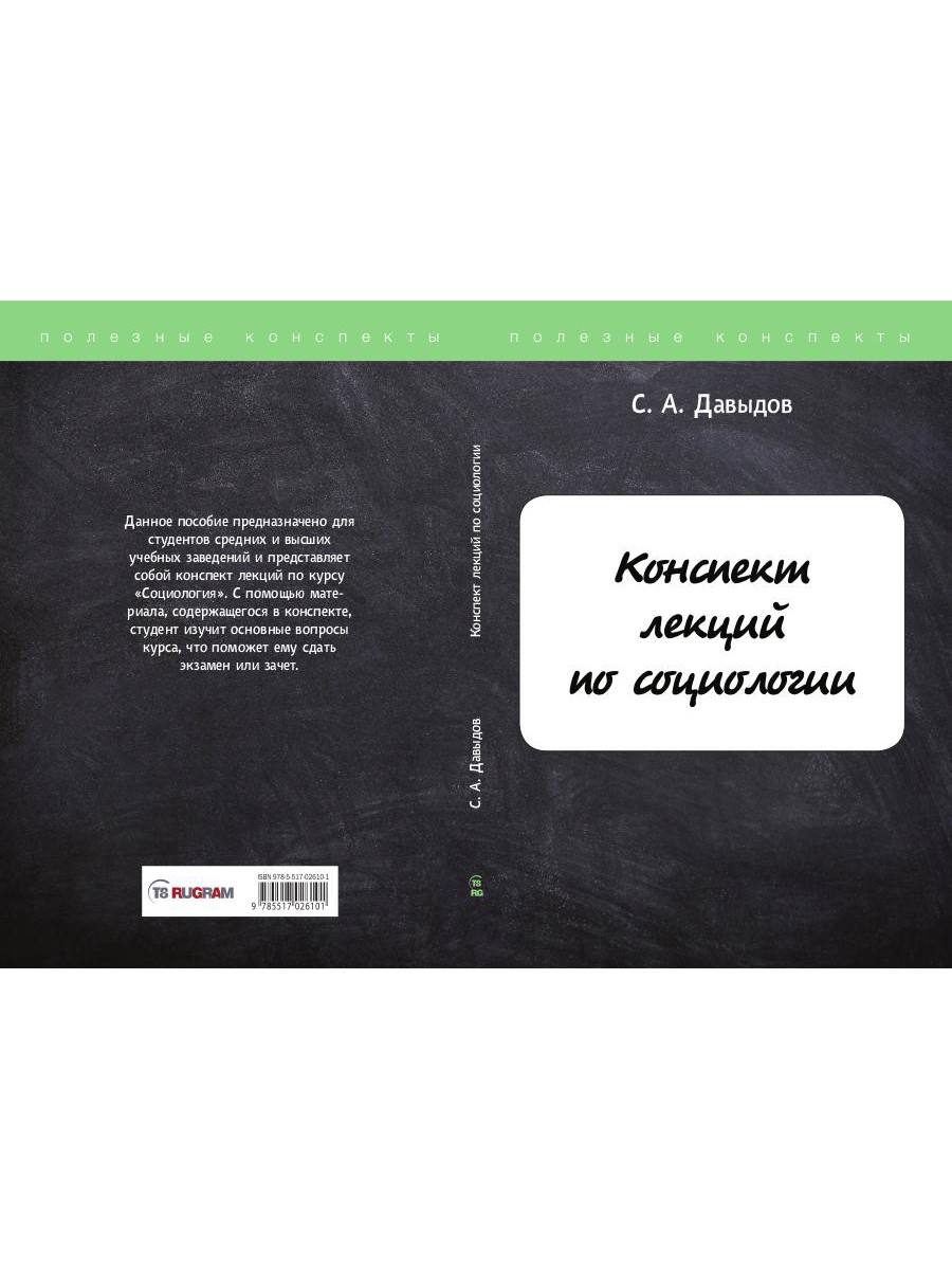 Данное пособие предназначено для студентов средних и высших учебных заведений и представляет собой конспект лекций по курсу «Социология». С помощью материала, содержащегося в конспекте, студент изучит основные вопросы курса, что поможет ему сдать экзамен или зачет.| Издательство | Т8 RUGRAM |