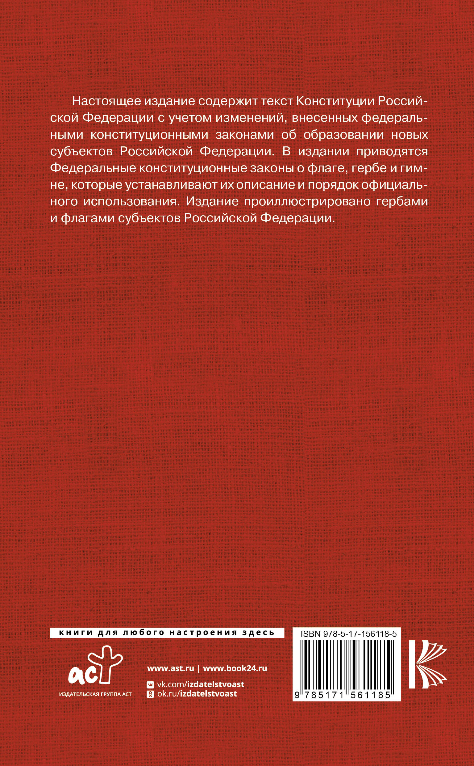 Настоящее издание содержит текст Конституции Российской Федерации с учетом изменений, внесенных федеральными конституционными законами от 4 октября 2022 г. об образовании новых субъектов Российской Федерации. В издании приводятся Федеральные конституционные законы о флаге, гербе и гимне, которые устанавливают их описание и порядок официального использования. Издание проиллюстрировано гербами и флагами субъектов Российской Федерации.| Издательство | ИЗДАТЕЛЬСТВО "АСТ" |