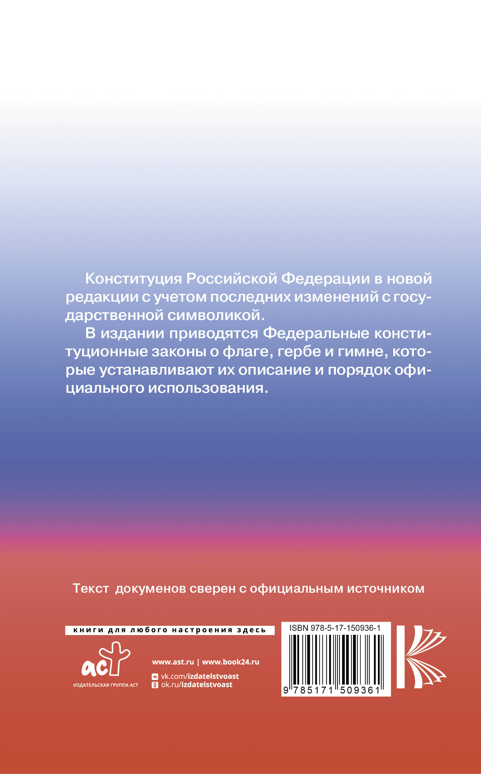 Конституция Российской Федерации в новой редакции с учетом последних изменений с госу- дарственной символикой. В издании приводятся Федеральные консти- туционные законы о флаге, гербе и гимне, кото- рые устанавливают их описание и порядок офи- циального использования.| Издательство | ИЗДАТЕЛЬСТВО "АСТ" |
