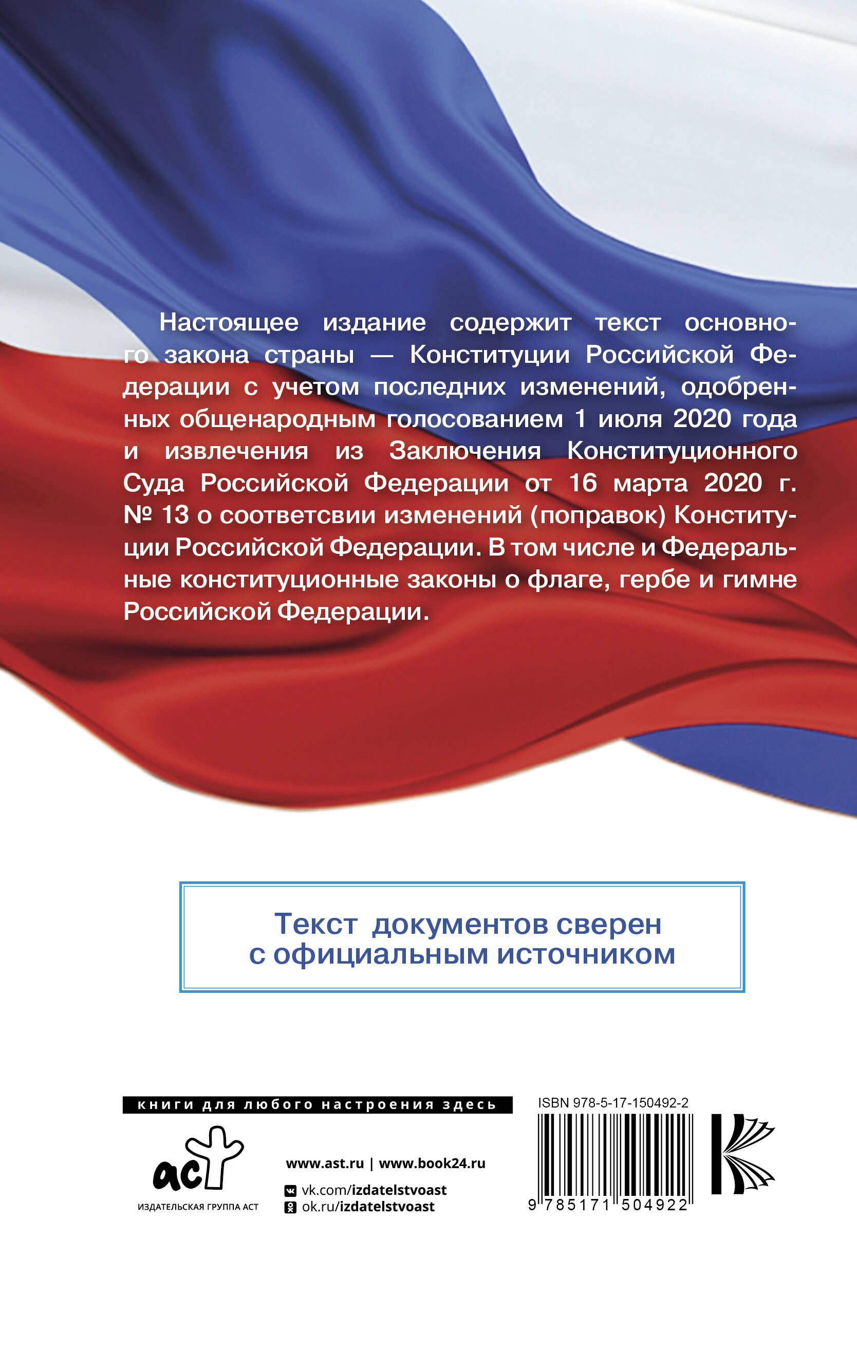 Настоящее издание содержит текст основного закона страны - Конституции Российской Федерации с учетом последних изменений, одобренных общенародным голосованием 1 июля 2020 года. Изменения в Конституции РФ обеспечивают верховенство российского права, гарантируют недопустимость изменения границ РФ, изменяют систему государственного управления, расширяют полномочия Государственной Думы, в соответствии с ними создается Государственный совет. В Конституции закреплены приоритеты социальной политики государства, уровень МРОТ не ниже прожиточного минимума, ежегодная индексация пенсий, пособий и социальных выплат. Президенту РФ, высшим государственным чиновникам, депутатам Государственной думы и сенаторам, губернаторам, прокурорам и судьям запрещается иностранное гражданство и владение зарубежными банковскими счетами. Для широкого круга читателей| Издательство | АСТ |