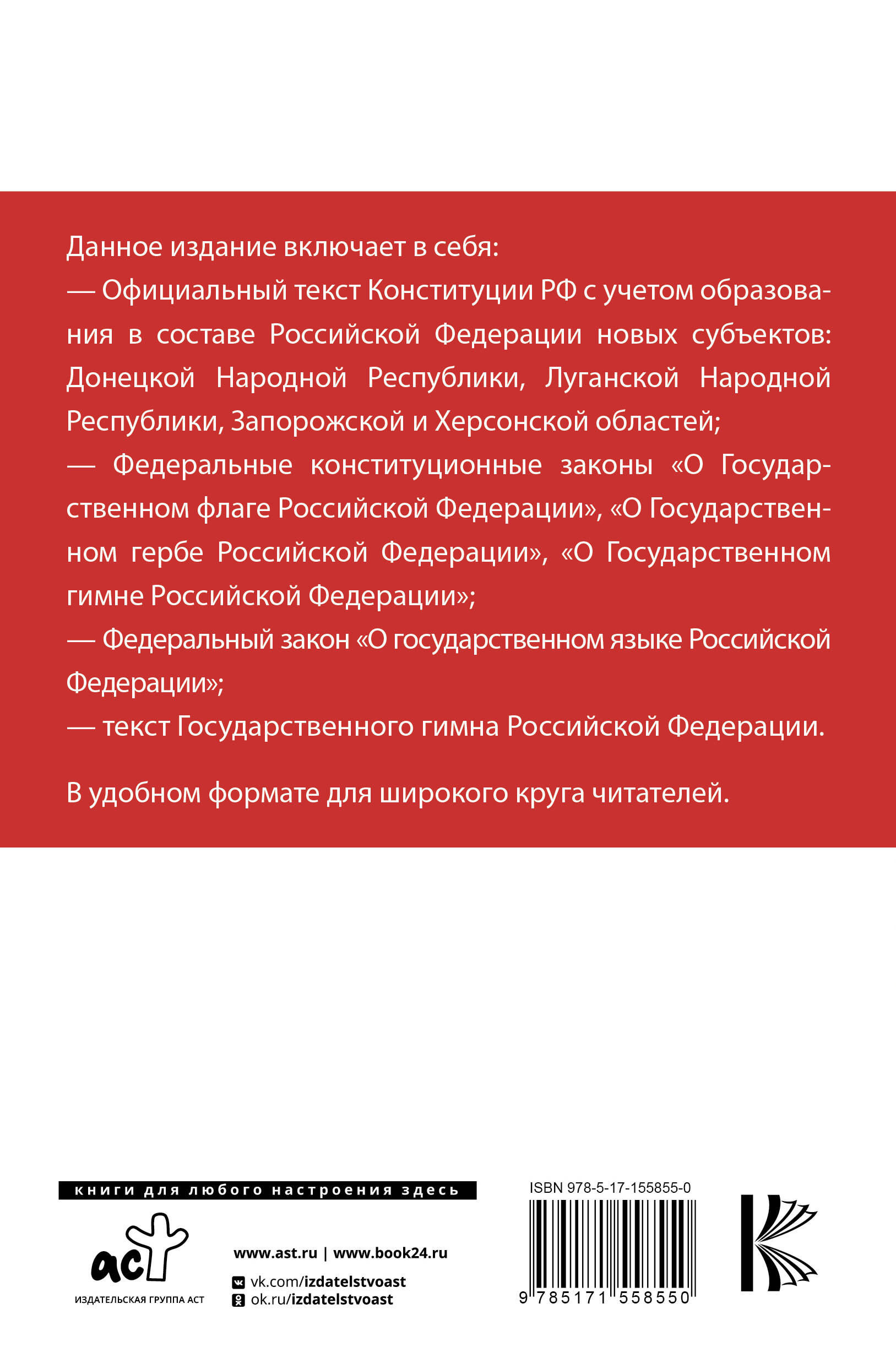 Аннотация: Конституция Российской Федерации с учетом новых субъектов РФ и Федеральный закон "О государственном языке РФ" в редакции от 28.02.2023. Флаг, герб, гимн.