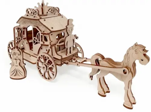 В набор входит фигурка лошади, кучера и принцессы. У собранной деревянной кареты вращаются колеса, открываются дверцы кареты.