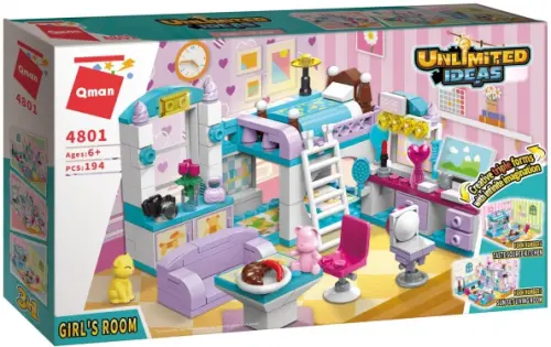 Яркий, красочный конструктор 3 в 1 QMAN из серии «Unlimited Ideas» переносит нас в уютную комнату современной девчонки. Ребенок сможет собрать собственными руками предметы обстановки и расставить мебель на свой вкус. Предусмотрено три варианта сборки обстановки. Простое и надежное соединение деталей разных размеров и форм между собой обеспечат специальные крепления. Во время игры ребенок сможет задействовать свою фантазию и придумать интересные сценарии. В процессе сборки и игры с готовой моделью юный конструктор будет развивать мелкую моторику рук, пространственное мышление, внимательность и усидчивость.