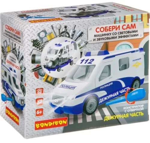 Конструктор с отверткой непременно понравится любому мальчику! Набор с подробной инструкцией поможет собрать детализированный, красивый полицейский автомобиль, обладающий световыми и звуковыми эффектами! Изготовлен из качественных, гипоаллергенных материалов. Колёса автомобиля выполнены из резины, собранная машина может ездить по ровной поверхности.