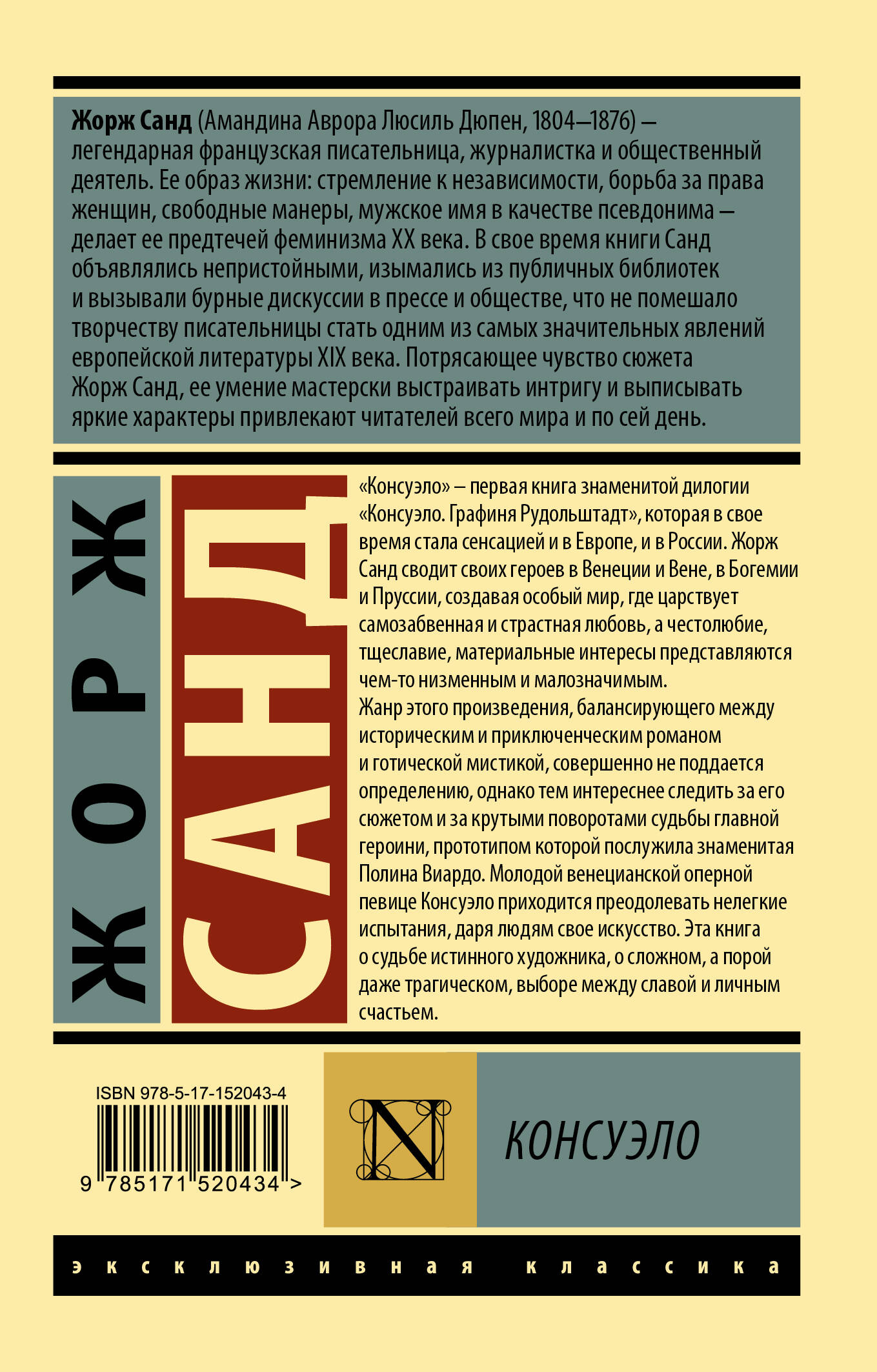 "Консуэло" - первая книга знаменитой дилогии "Консуэло. Графиня Рудольштадт", которая в свое время стала сенсацией и в Европе, и в России. Жорж Санд сводит своих героев в Венеции и Вене, в Богемии и Пруссии, создавая особый мир, где царствует самозабвенная и страстная любовь, а честолюбие, тщеславие, материальные интересы представляются чем-то низменным и малозначимым. Жанр этого произведения, балансирующего между историческим и приключенческим романом и готической мистикой, совершенно не поддается определению, однако тем интереснее следить за его сюжетом и за крутыми поворотами судьбы главной героини, прототипом которой послужила знаменитая Полина Виардо. Молодой венецианской оперной певице Консуэло приходится преодолевать нелегкие испытания, даря людям свое искусство. Это книга о судьбе истинного художника, о сложном, а порой даже трагическом выборе между славой и личным счастьем.| Издательство | ИЗДАТЕЛЬСТВО "АСТ" |