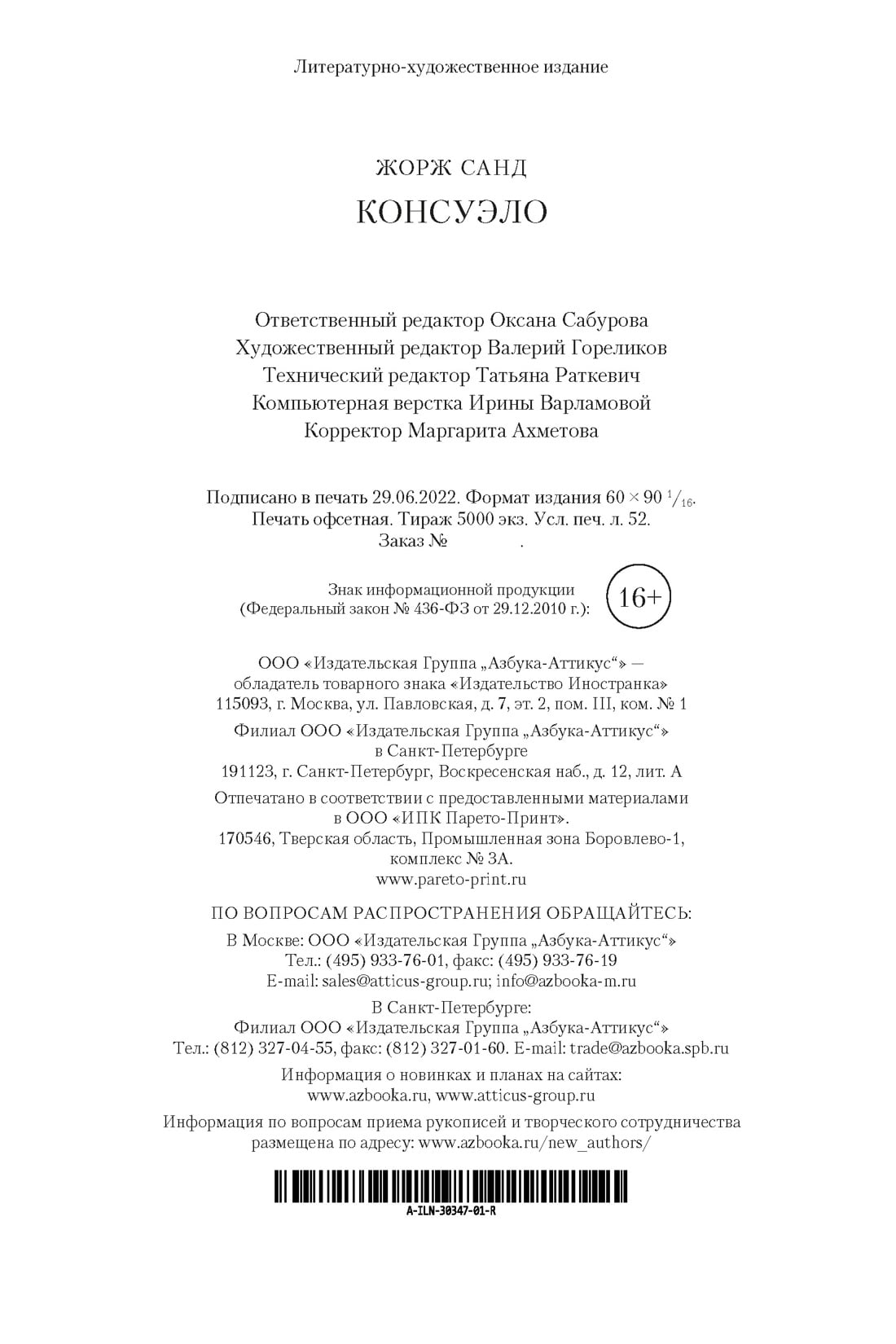 Жорж Санд (настоящее имя Аврора Дюпен, в замужестве баронесса Дюдеван) - легендарная французская писательница, творчество которой стало одним из самых значительных явлений европейской литературы XIX века. Стремление к независимости, свободный образ жизни, утверждение права женщины выбирать возлюбленного и пренебрежение брачными узами, мужское имя в качестве псевдонима и мужской костюм - все это сделало писательницу предтечей феминизма XX века. «Консуэло» - один из лучших романов Жорж Санд, написанный в пору творческой зрелости и, как многие произведения писательницы, вызвавший бурные споры и полярные оценки современников. В основе повествования - мотивы трагического столкновения артиста и общества, трудного выбора между карьерой, успехом и тихой семейной заводью. Прототипом главной героини романа послужила знаменитая испано-французская оперная певица Полина Виардо, бывшая музой И. С. Тургенева.| Издательство | Иностранка |