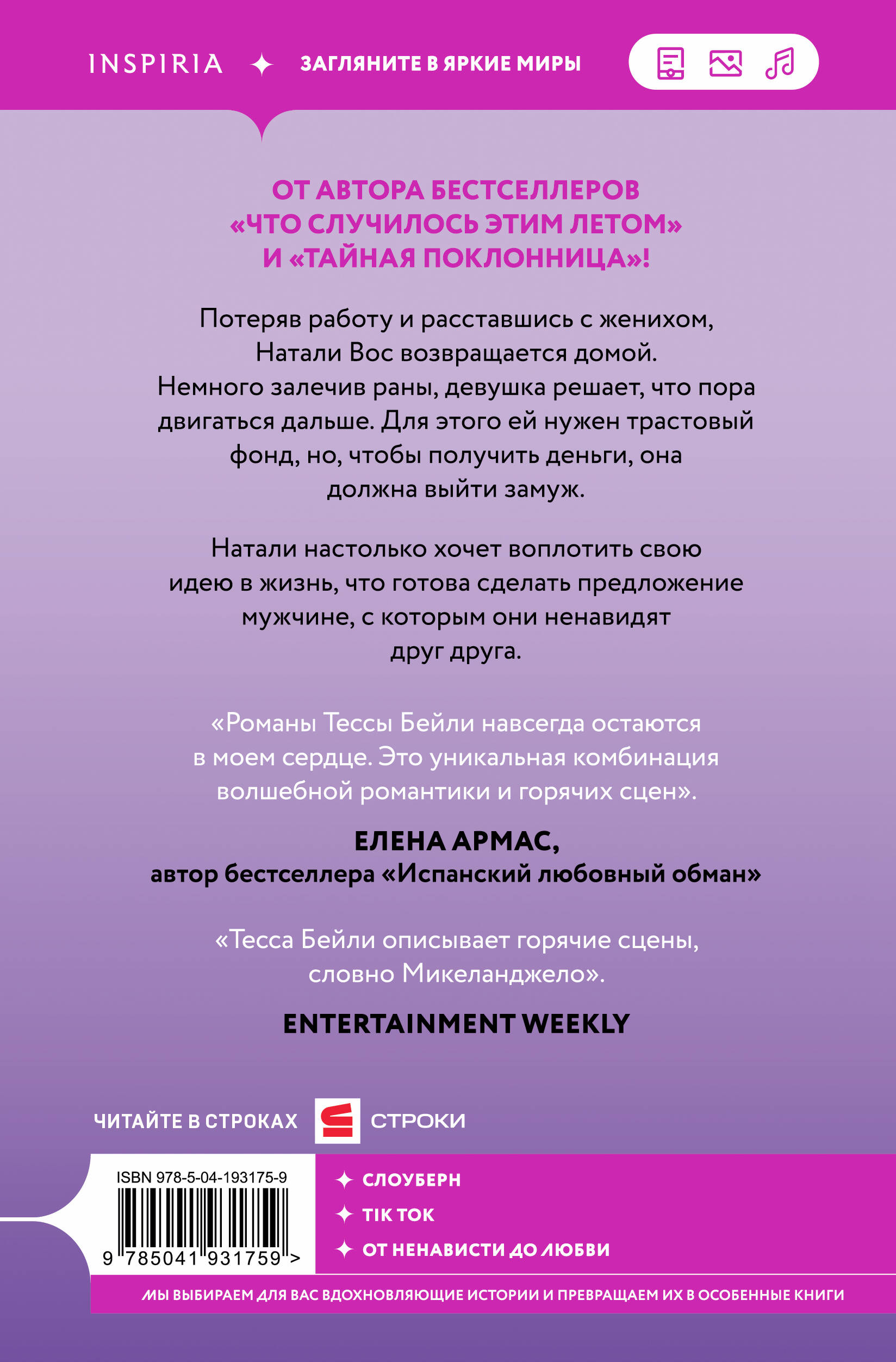 Потеряв работу и расставшись с женихом, Натали Вос возвращается домой. Немного залечив раны, девушка решает, что пора двигаться дальше. Для этого ей нужен трастовый фонд, но, чтобы получить деньги, она должна выйти замуж. Натали настолько хочет воплотить свою идею в жизнь, что готова сделать предложение мужчине, с которым они ненавидят друг друга.| Издательство | ООО "Издательство "Эксмо" |