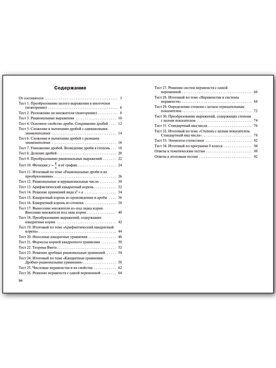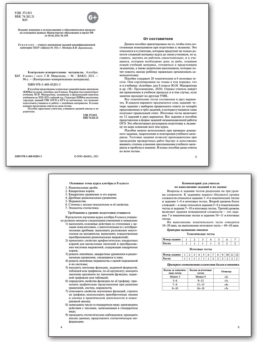 В пособии представлены контрольно-измерительные материалы (КИМы) по курсу «Алгебра» для 8 класса. Порядок тем соответствует учебнику Ю.Н. Макарычева, входящему в федеральный перечень учебников на 2020/2021 учебный год. Структура КИМов аналогична структуре заданий ГИА (ОГЭ) и ЕГЭ по математике, что позволит подготовить учащихся к работе с подобным материалом. В конце издания предложены ответы ко всем тестам.