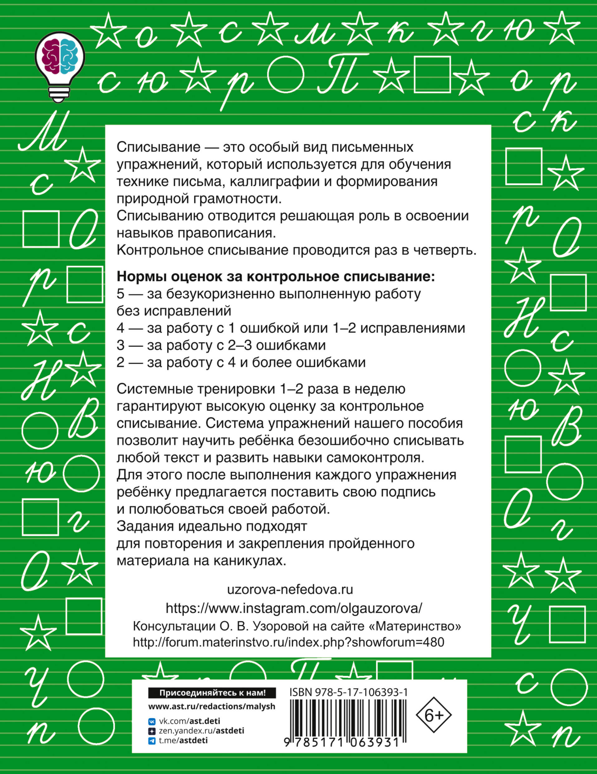 Учебное пособие известных педагогов-практиков О. В. Узоровой и Е. А. Нефёдовой позволит ученикам научиться без ошибок списывать любой текст, выработать каллиграфический почерк, повысить грамотность, развить память и внимание. Этот тренажер создан для заботливых родителей и старательных учеников. • Авторская методика выдающегося педагога-практика О.В.Узоровой. • Списывание - особый вид письменных упражнений для обучения технике письма, каллиграфии и формирования природной грамотности. • Списыванию отводится важная роль в освоении навыков правописания. • Запоминать слова, части предложения и предложения целиком полезно не только для формирования навыка списывания, но и для скорочтения. • Учебное пособие можно использовать на уроках русского языка и при домашней работе.| Издательство | ИЗДАТЕЛЬСТВО "АСТ" |