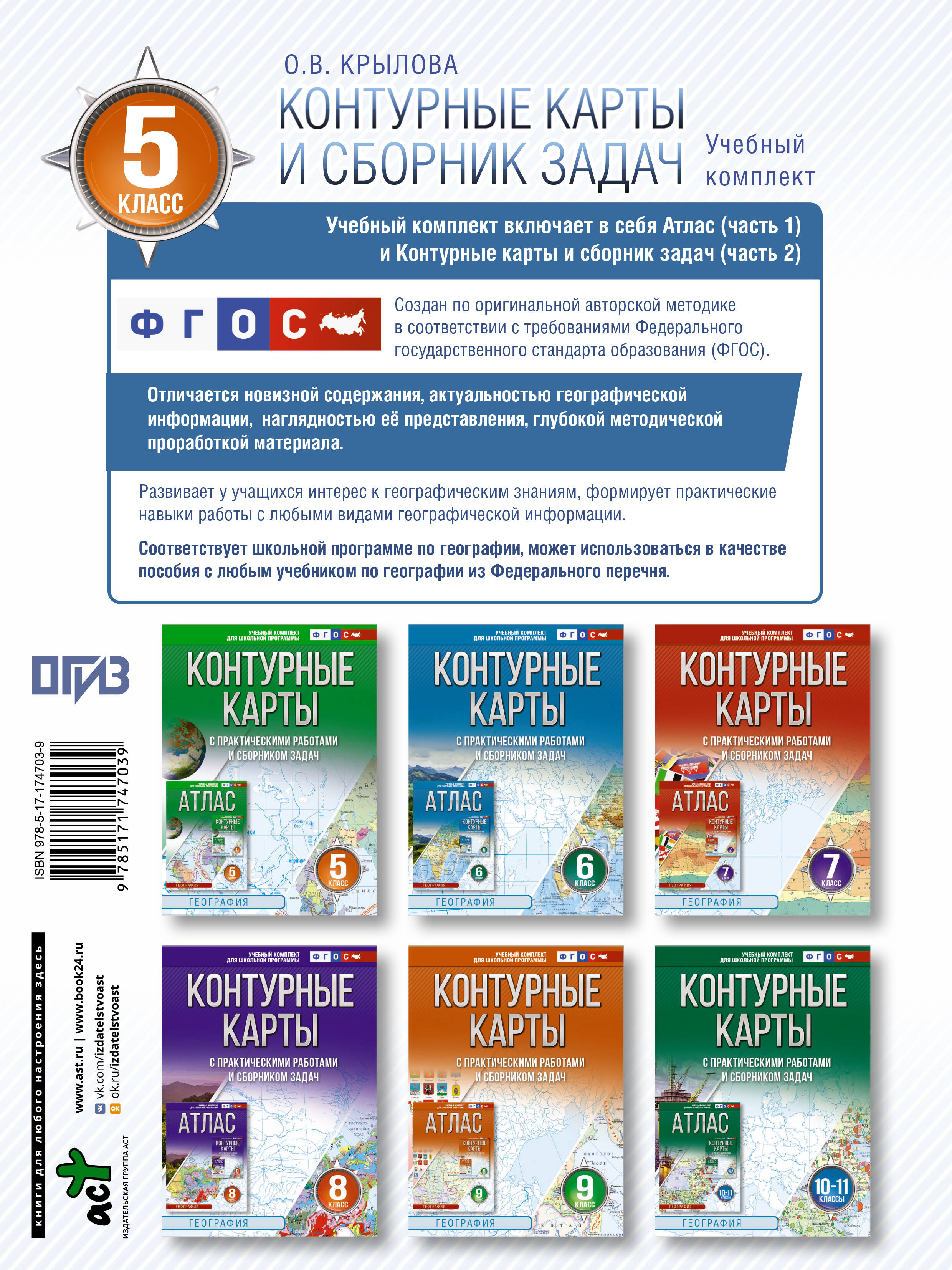 Учебно-методический комплект по географии для 5-го класса (автор - О.В. Крылова) состоит из контурных карт с практическими работами и сборника задач по работе с атласом по географии для 5-го класса. Их главная цель - привить учащимся интерес к географическим знаниям. Содержание материалов комплекта направлено на усвоение учащимися основ знаний о Вселенной и планете Земля, а также на формирование у них первоначальных картографических умений: определять стороны горизонта и взаиморасположение географических объектов, составлять элементарные географические описания, сравнивать и классифицировать. Созданный по оригинальной авторской методике в соответствии с "Концепцией развития географического образования в Российской Федерации", комплект характеризуется новизной содержания, универсальностью, нацеленностью на развитие творческого начала у школьников. Учебное пособие соответствует требованиям ФГОС и одобрено методистами.| Издательство | Издательство "АСТ" |