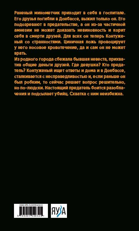 Раненый минометчик приходит в себя в госпитале. Его друзья погибли в Донбассе, выжил только он. Его подозревают в предательстве, а он из-за частичной амнезии не может доказать невиновность и корит себя в смерти друзей. Для всех он теперь Контуженый со странностями. Циничная ложь провоцирует у него носовое кровотечение, да и сам он не может врать. Из родного города сбежала бывшая невеста, прихватив общие деньги друзей. Где девушка? Кто предатель? Контуженый ищет ответы и дома и в Донбассе, сталкивается с несправедливостью и, если раньше он был робким, то сейчас решает вопрос решительно, но по-людски. Настоящий предатель боится разоблачения и подсылает убийц. Схватка с ним неизбежна.| Издательство | Яуза-каталог ООО |