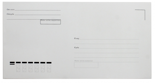 Конверт.<br /> Размер 110 х 220 мм.<br /> Прямоугольный.<br /> Бумага белая.<br /> Клеевое нанесение стрип (отрывная силиконовая лента).<br /> Поля куда - кому, от кого - откуда.<br /> Сделано в России.