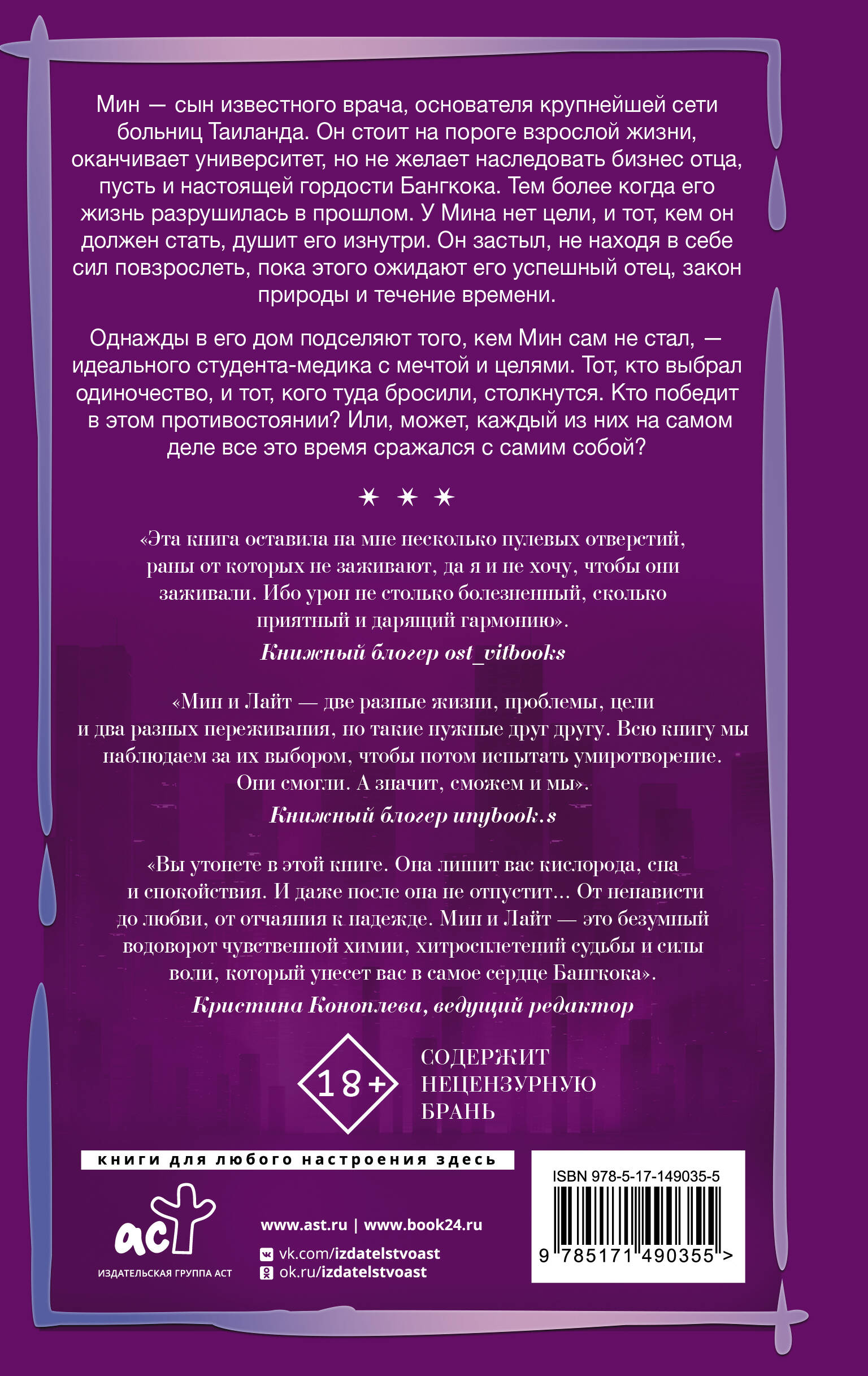 ДЛЯ АУДИТОРИИ БЕСТСЕЛЛЕРОВ «КРАСНЫЙ, БЕЛЫЙ И КОРОЛЕВСКИЙ СИНИЙ», «ВСЕГО ЛИШЬ ПОЛНОСТЬЮ РАЗДАВЛЕН» И «ЗА СТЕНКОЙ». КОГДА СОБСТВЕННЫЕ КООРДИНАТЫ ВЗРОСЛЕНИЯ УСКОЛЬЗАЮТ, ЧУЖОЙ ОРИЕНТИР МОЖЕТ ПРИВЕСТИ К НУЖНОЙ ТОЧКЕ Вторая книга в серии «Звезды молодежной прозы на русском», аналога серии «Звезды молодежной прозы», но с российскими авторами. История любви, которая понравится всем фанатам Софи Гонзалес, Кейси Маккуинстон и Габриэля Коста. Роман о взрослении. конфликте поколений и исцеляющей любви Мин - сын известного врача, основателя крупнейшей сети больниц Таиланда. Он стоит на пороге взрослой жизни, оканчивает университет, но не желает наследовать бизнес отца. У него нет цели и сил для того, чтобы повзрослеть. Однажды в его дом подселяют того, кем Мин не стал, - идеального студента-медика с мечтой и планами на жизнь. Тот, кто выбрал одиночество, и тот, кого туда бросили, столкнутся. Кто победит в этом противостоянии? Или, может, каждый из них на самом деле все это время сражался с самим собой?| Издательство | АСТ |
