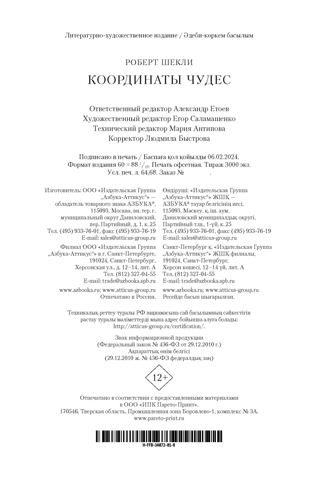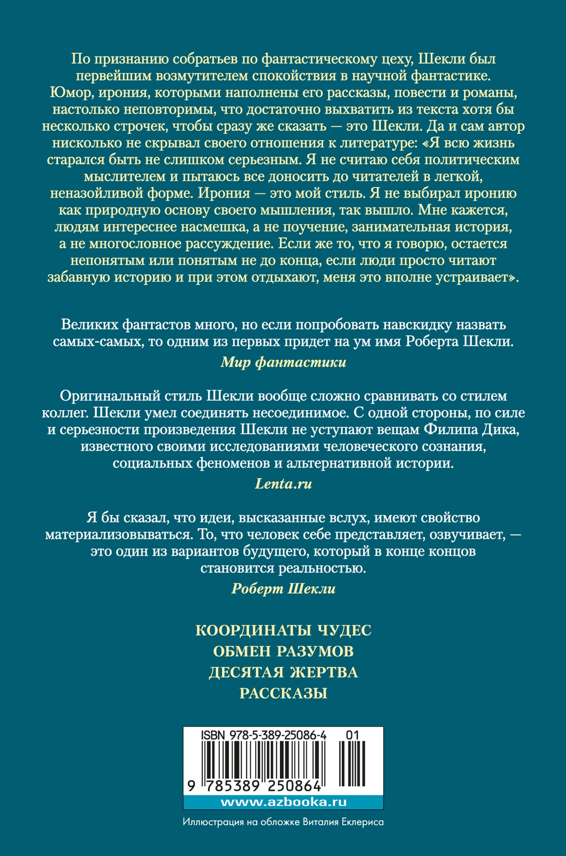 По признанию собратьев по фантастическому цеху, Шекли был первейшим возмутителем спокойствия в научной фантастике. Юмор, ирония, которыми наполнены его рассказы, повести и романы, настолько неповторимы, что достаточно выхватить из текста хотя бы несколько строчек, чтобы сразу же сказать - это Шекли. Да и сам автор нисколько не скрывал своего отношения к литературе: «Я всю жизнь старался быть не слишком серьезным. Я не считаю себя политическим мыслителем и пытаюсь все доносить до читателей в легкой, неназойливой форме. Ирония - это мой стиль. Я не выбирал иронию как природную основу своего мышления, так вышло. Мне кажется, людям интереснее насмешка, а не поучение, занимательная история, а не многословное рассуждение. Если же то, что я говорю, остается непонятым или понятым не до конца, если люди просто читают забавную историю и при этом отдыхают, меня это вполне устраивает».| Издательство | Азбука |