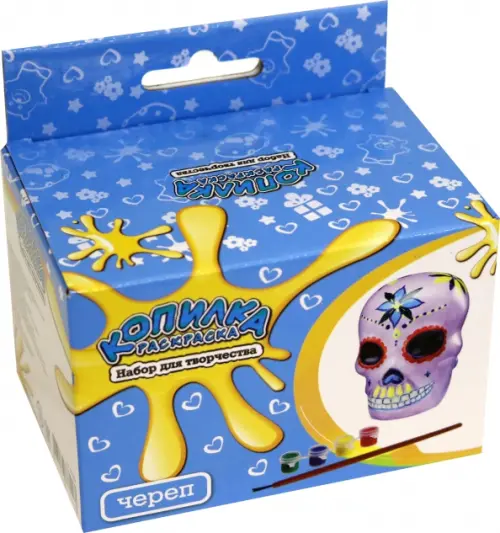 Копилка сделана из пластика белого цвета. Сохранена не только форма черепа, но и рельеф, что облегчает процесс раскрашивания. Фигурку нельзя разбить или поцарапать, она легкая и прочная. Удобный набор для творчества уже содержит основные материалы для работы - саму копилку, краски базовых цветов и кисточку.