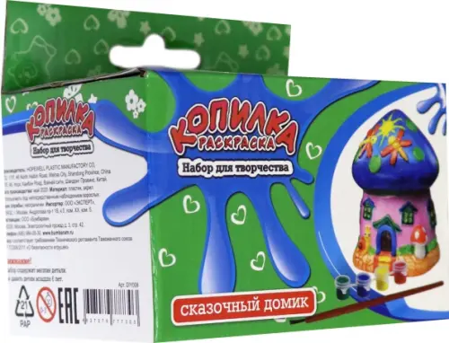В комплекте: белая копилка, краски 4 цветов, кисточка.