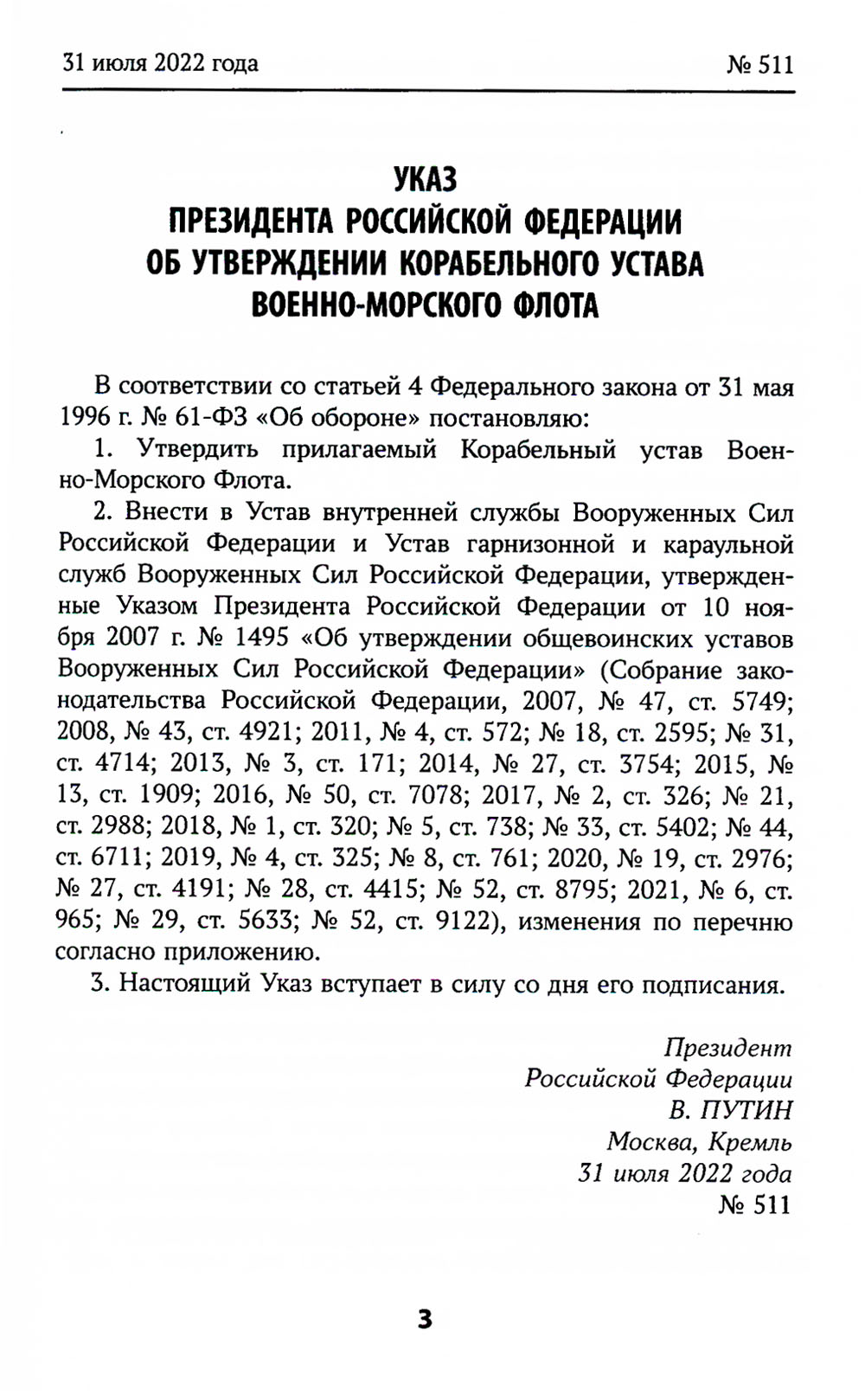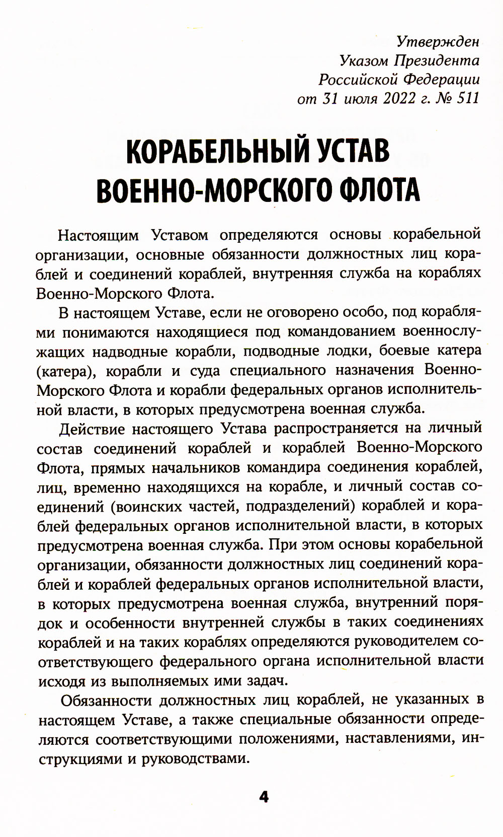 В книге приведен полный текст Корабельного устава Военно-Морского Флота, утвержденный Указом Президента Российской Федерации от 31 июля 2022 года № 511. Настоящим Уставом определяются основы корабельной организации, основные обязанности должностных лиц кораблей и соединений кораблей, внутренняя служба на кораблях Военно-Морского Флота.