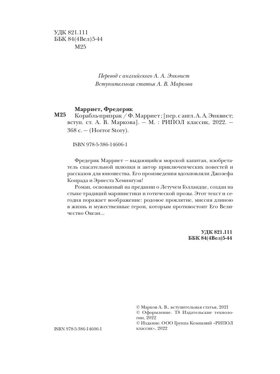 Фредерик Марриет - выдающийся морской капитан, изобретатель спасательной шлюпки и автор приключенческих повестей и рассказов для юношества. Его произведения вдохновляли Джозефа Конрада и Эрнеста Хемингуэя! Роман, основанный на предании о Летучем Голландце, создан на стыке традиций маринистики и готической прозы. Этот текст и сегодня поражает воображение: родовое проклятие, миссия длиною в жизнь и мужественные герои, которым противостоит Его Величество Океан…