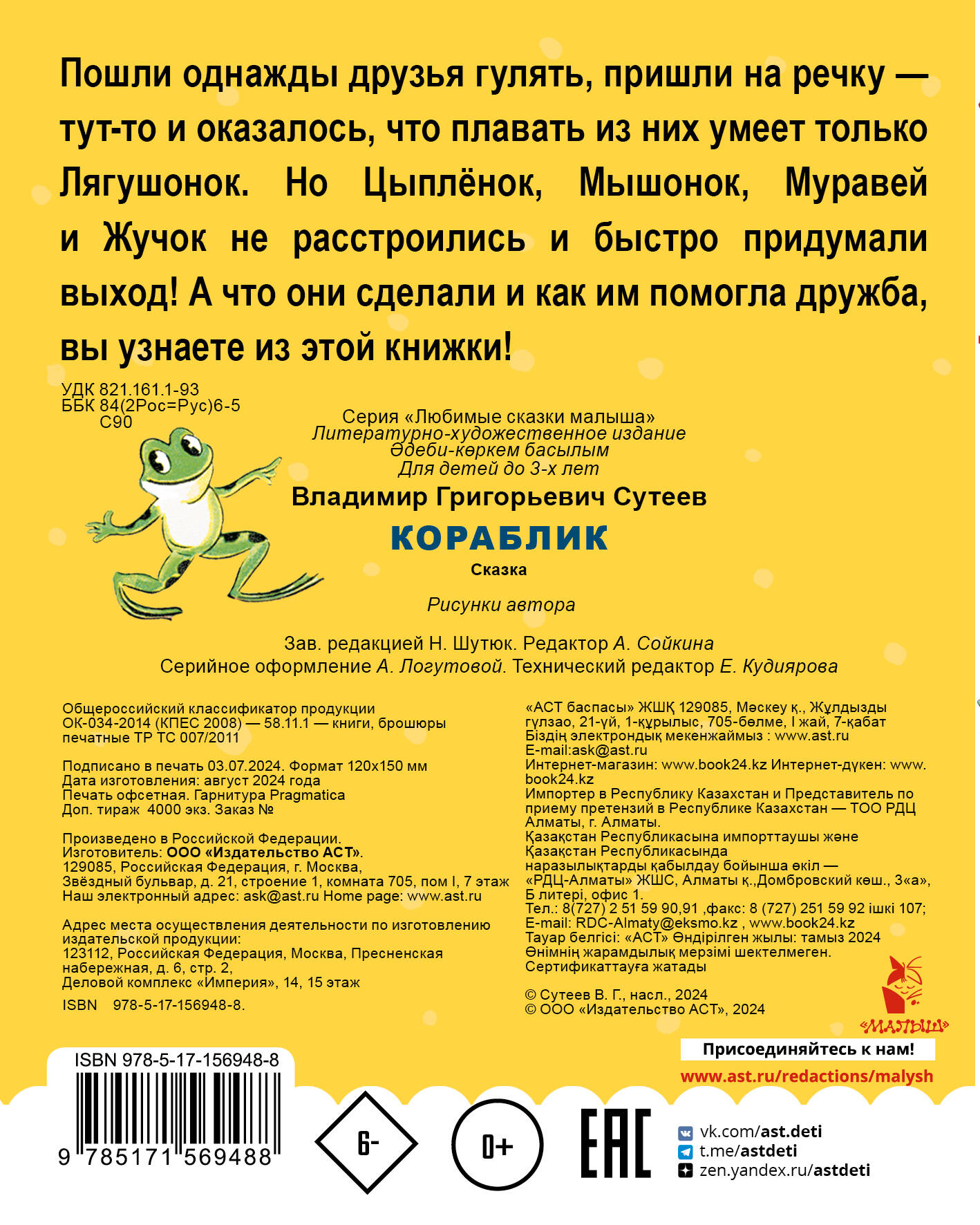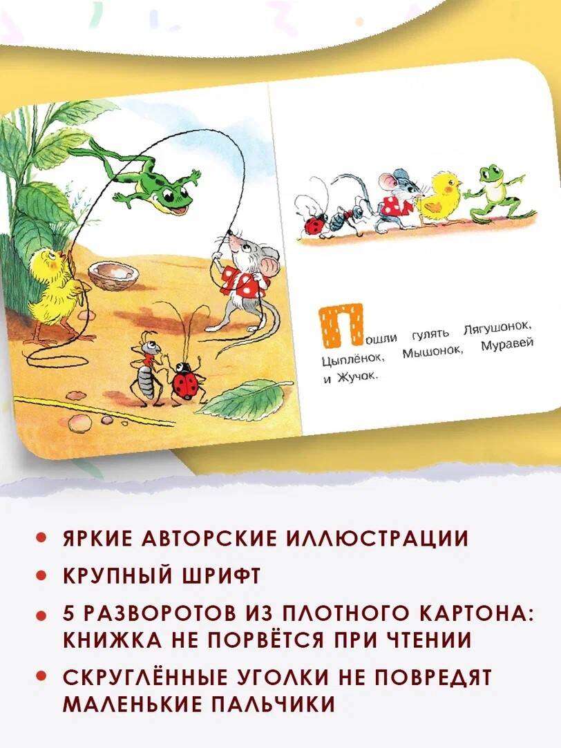 Пошли однажды друзья гулять, пришли на речку - тут-то и оказалось, что плавать из них умеет только Лягушонок. Но Цыплёнок, Мышонок, Муравей и Жучок не расстроились и быстро придумали выход! А что они сделали и как им помогла дружба, вы узнаете из этой книжки! Владимир Григорьевич Сутеев - классик отечественной детской литературы. Его сказки - простые, понятные, но по-своему увлекательные - особенно интересны самым маленьким читателям. Ведь почти каждая фраза в них сопровождается рисунком, и историю можно проследить по картинкам. Эта книга предназначена именно для малышей: в ней яркие рисунки и крупные буквы, плотный картон не порвется при чтении, а скругленные уголки не повредят маленькие пальчики.| Издательство | ИЗДАТЕЛЬСТВО "АСТ" |