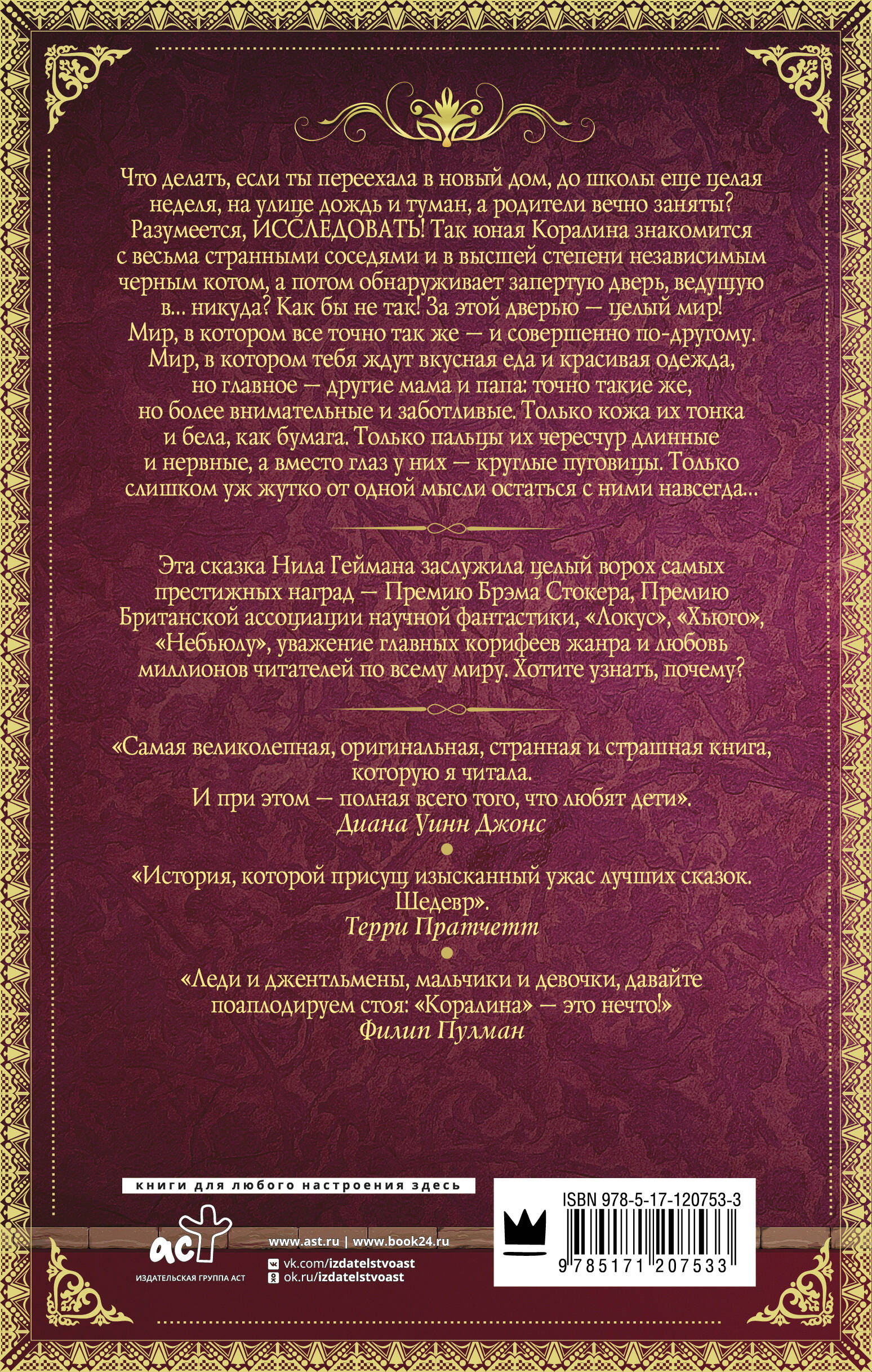 Что делать, если ты переехала в новый дом, до школы еще целая неделя, на улице дождь и туман, а родители вечно заняты? Разумеется, ИССЛЕДОВАТЬ! Так юная Коралина знакомится с весьма странными соседями и в высшей степени независимым черным котом, а потом обнаруживает запертую дверь, ведущую в… никуда? Как бы не так! За этой дверью - целый мир! Мир, в котором все точно так же - и совершенно по-другому. Мир, в котором тебя ждут вкусная еда и красивая одежда, но главное - другие мама и папа: точно такие же, но более внимательные и заботливые. Только кожа их тонка и бела, как бумага. Только пальцы их чересчур длинные и нервные, а вместо глаз у них - круглые пуговицы. Только слишком уж жутко от одной мысли остаться с ними навсегда…| Издательство | ИЗДАТЕЛЬСТВО "АСТ" |